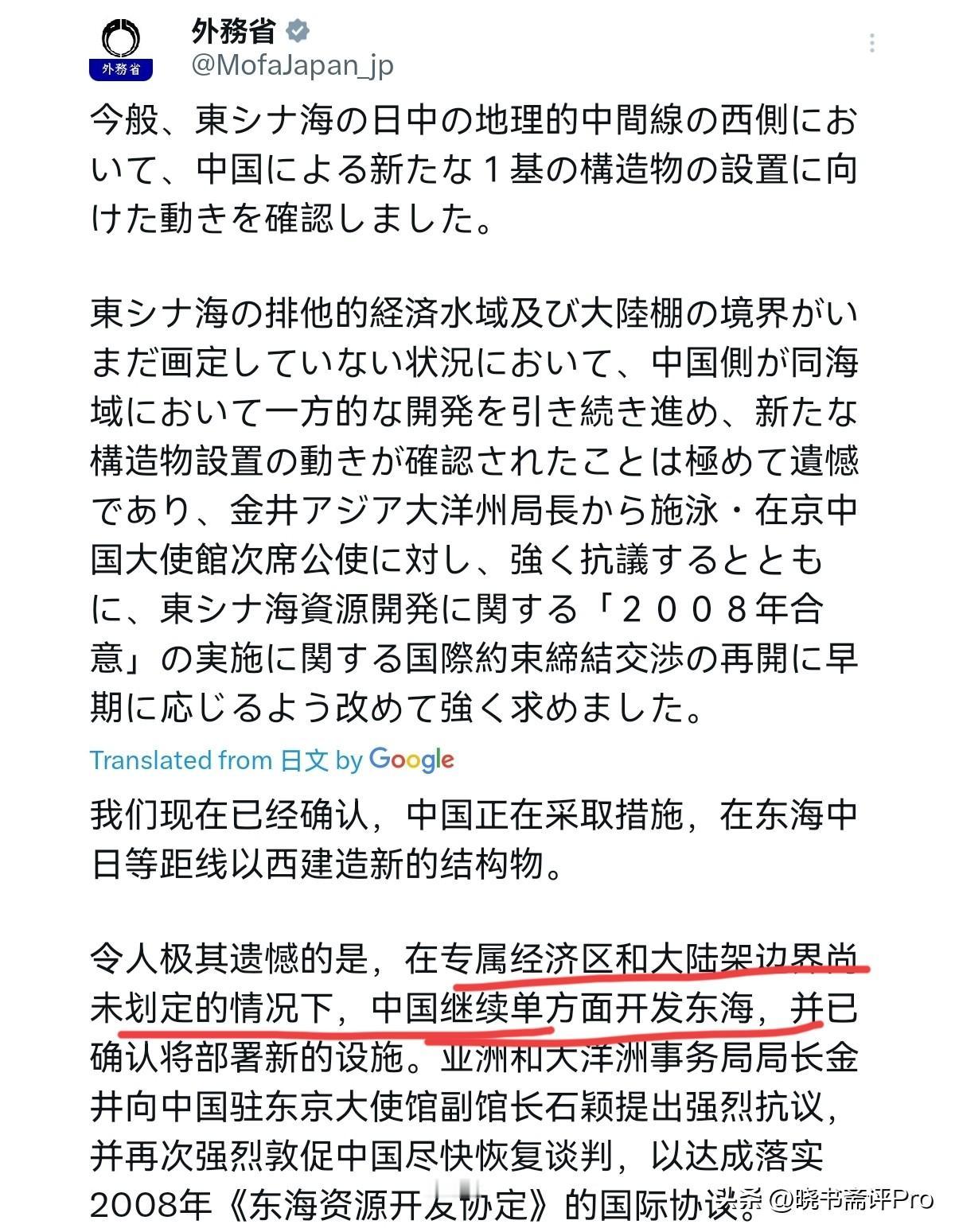 我们的动作越来越强势了,日本再次用抗议回应我们!1月16日,日本外务省声称,我方确认,中国近期正着手在东海日中所谓“中间线”西侧海域,新建一处设施。在东海专属经济区及大陆架界限尚未划定的情况下,中方持续在相关海域“单方面”推进开发活动,此番又确认到其新建设施的动向,我方对此深表遗憾。 日本外务省亚洲大洋洲局局长金井已向中国驻日大使馆公使提出严正抗议,并重申强烈要求中方尽早回应,重启关于缔结落实2008年《东海问题原则共识》国际约束的谈判。很显然,面对我们在相关经济水域越来越强势的动作,日本现在是只能通过抗议对我们表达不满了。 不过,要说以前碍于两国关系相对友好,我们会克制自己的动作,现在中日政治关系动摇之后,那我们就没有那么多顾忌了。既然日本方面认为相关海域尚未划定,那由此可以确定,相关海域也并不归属于日本。事实上,东海日中所谓“中间线”其实并没有任何法理依据,我们根本不承认。 从法理上来说,大陆架是陆地领土的自然延伸,东海大陆架一直延伸到冲绳海槽,这是天然分界,中方在自然延伸范围内的开发是固有主权权利,根本无需日方“许可” ,日本进行抗议,目的是造成既成事实,但是我们根本不会予以理会。现在中日关系不友好,谈判根本没有重启的条件,我们当然不会因为日本的抗议,而停止相关活动。