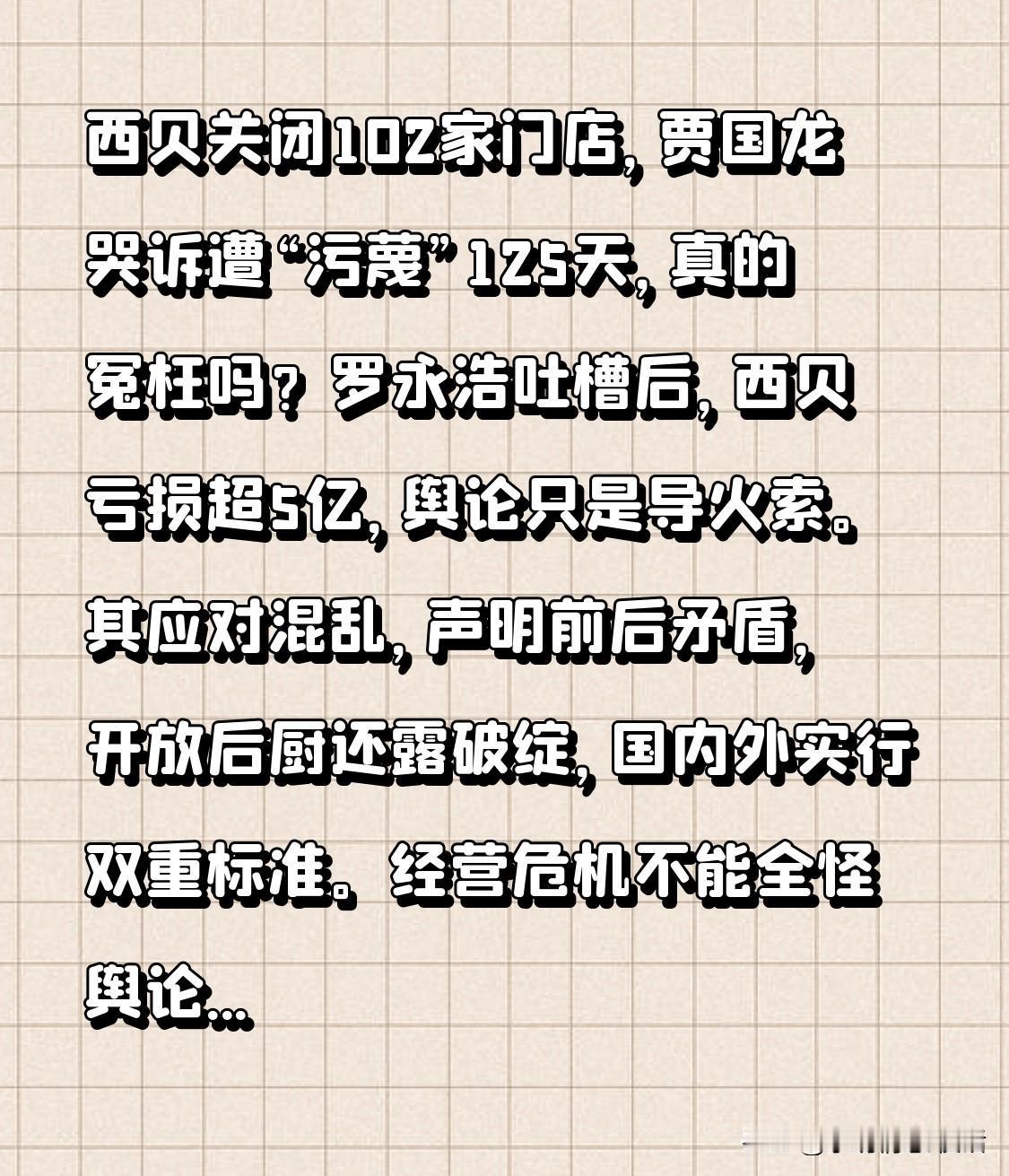西贝关闭102家门店,贾国龙哭诉遭“污蔑”125天,真的冤枉吗?罗永浩吐槽后,西贝亏损超5亿,舆论只是导火索。其应对混乱,声明前后矛盾,开放后厨还露破绽,国内外实行双重标准。经营危机不能全怪舆论,西贝能否翻身?点赞关注,看后续发展! 西贝现状 西贝餐饮 西贝降热搜账单