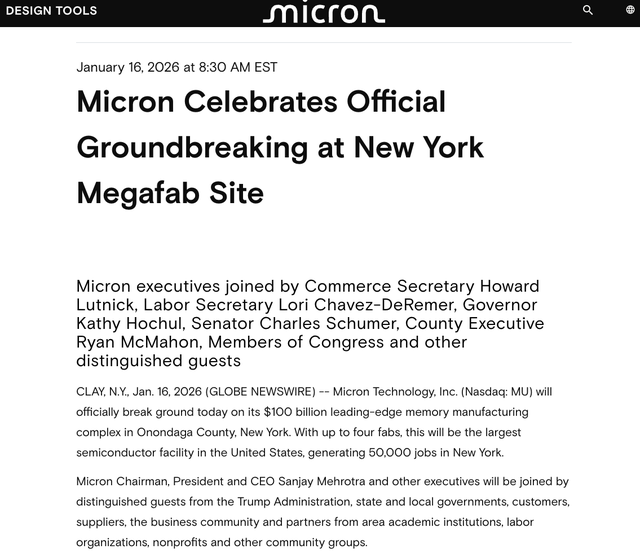 消息面上,公司周五在美国纽约州奥农多加县为投资高达1000亿美元的内存制造综合体举行奠基仪式。公司在公告中确认,该项目将建最多四座晶圆厂,将成为美国最大半导体设施和全球最先进的存储制造基地。该设施计划于2030年投产,产能将在后续10年里逐步爬坡。