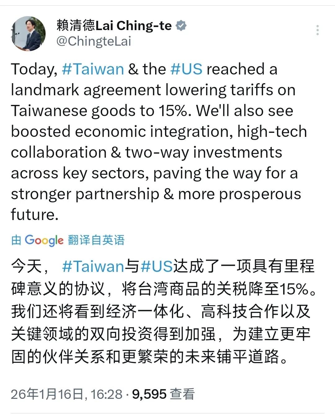 近日,台湾地区行政机构副负责人召开记者会宣称:“台湾是全球首个获得美国232关税最优惠待遇的地区。” 与此同时,赖某还在社交媒体上喜形于色地表示:“今天,台湾与美国达成了一项具有里程碑意义的协议,把台湾商品的关税降至15%。我们还会看到经济一体化、高科技合作以及关键领域的双向投资得到强化,为构建更稳固的伙伴关系和更繁荣的未来奠定基础。” 然而,台湾为拿到这15%的关税,却要付出5000亿美元!这所谓“最优惠待遇”与“里程碑协议”,实则藏着美国的诸多算计。赖某之流却沾沾自喜,丝毫不顾背后代价。 美国给的“糖”不但不甜。反而是一味毒药。“经济一体化、高科技合作及关键领域双向投资”不过是镜花水月。侵蚀台湾经济主权与产业自主性,加快搬空台湾的优势产业,才是美国的最终目的!