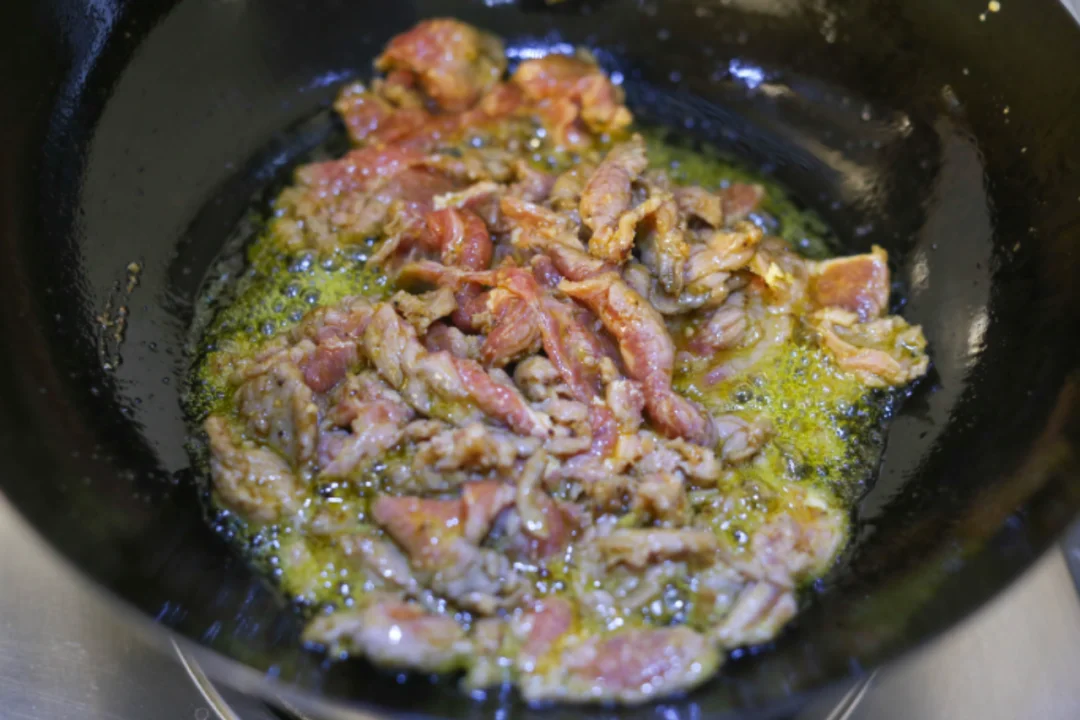 1:锅里多放一点油,热锅凉油,加入腌制好的牛肉轻轻滑炒一下,捞出来。