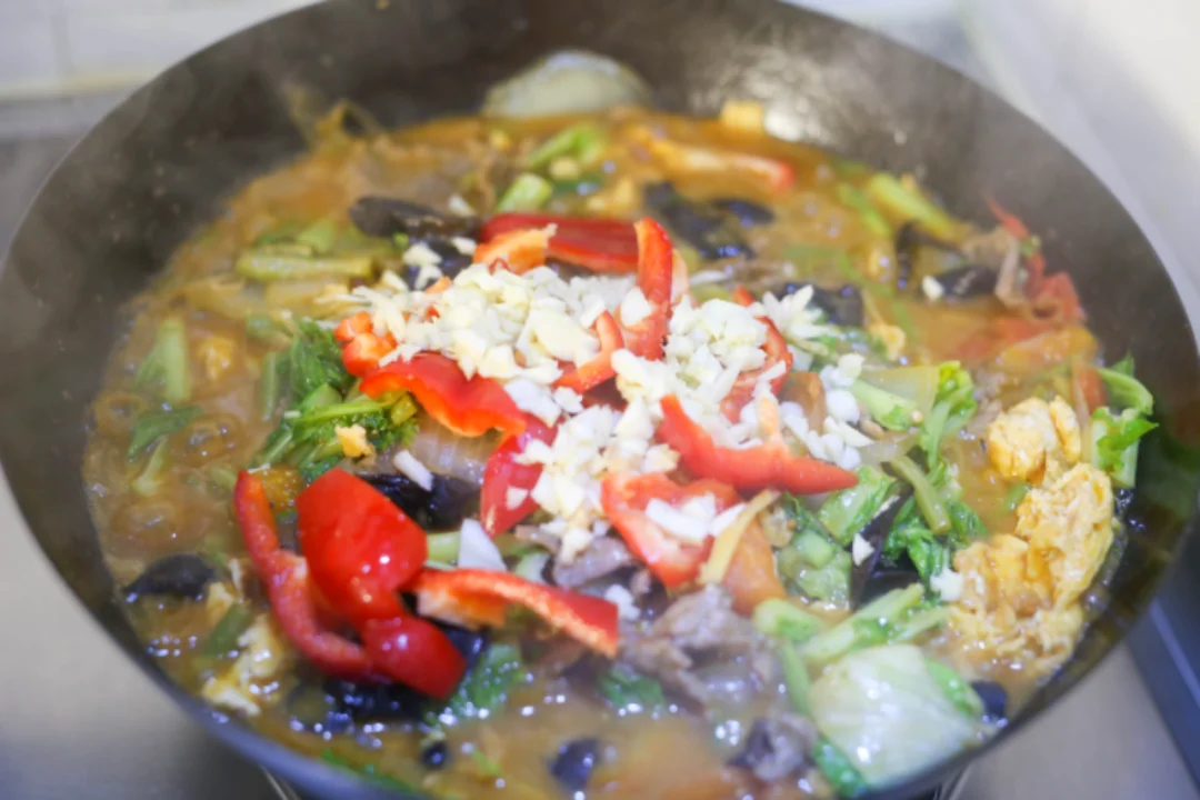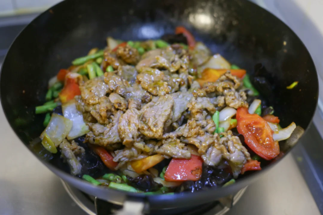 2:锅中放点底油,加入葱姜蒜炒出香味,加入辣椒(辣版本)洋葱炒香,加入蔬菜,放入炒好的牛肉,放入一点老抽增色,加入一点生抽,食用盐,加入一点水,快熟的时候放点蒜末翻炒出香味就可以了。