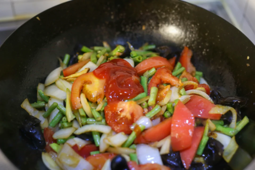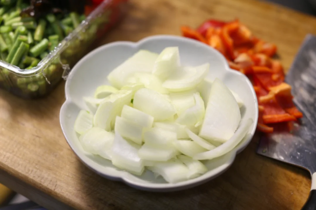 过油肉拌面必备的食材:洋葱、牛肉、木耳、豆角,白菜或者青菜,红辣椒(辣版本)青红黄辣椒(不辣版本)。
