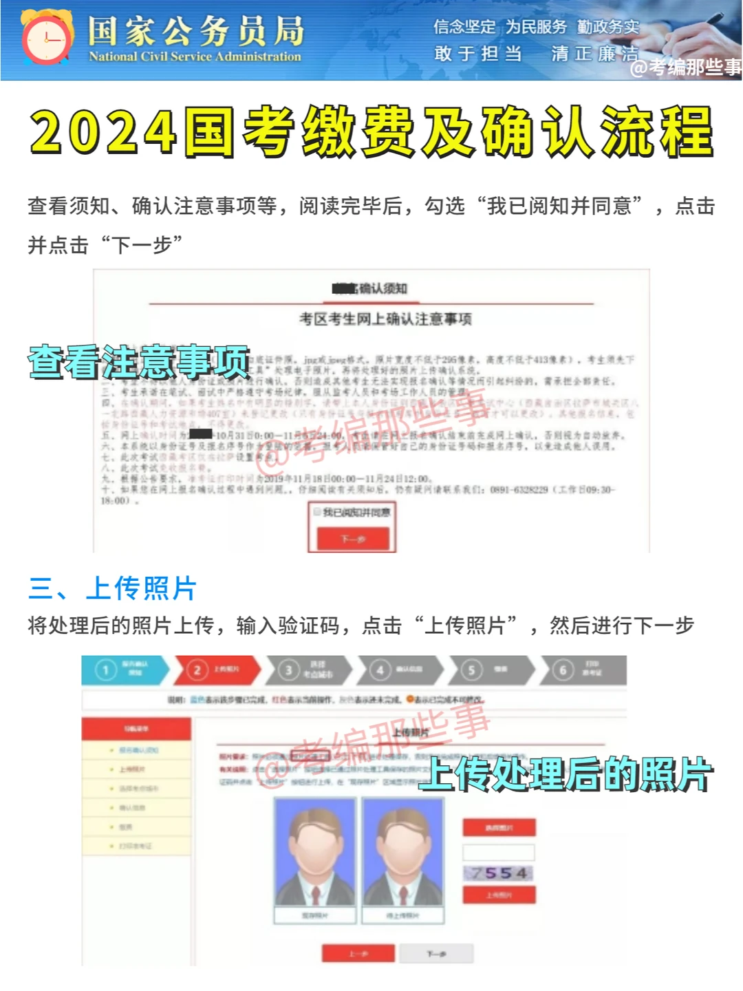 一、进入系统 点击“考生考务入口”进入,然后登录 二、阅读须知 仔细阅读须知、考场规则等,勾选“我已阅知并同意”并点击“下一步”; 查看须知、确认注意事项等,阅读完毕后,勾选“我已阅知并同意”,点击并点击“下一步” 三、上传照片 将处理后的照片上传,输入验证码,点击“上传照片”,然后进行下一步 四、选择考点城市 选择考点城市,如果该省只有一个考点城市系统会自动选中,点击“保存” 五、缴费 确认信息无误后,点击“网上支付”生成订单并支付,有的省份是免费的,点击“确认”按钮,抱 名确认就完成了