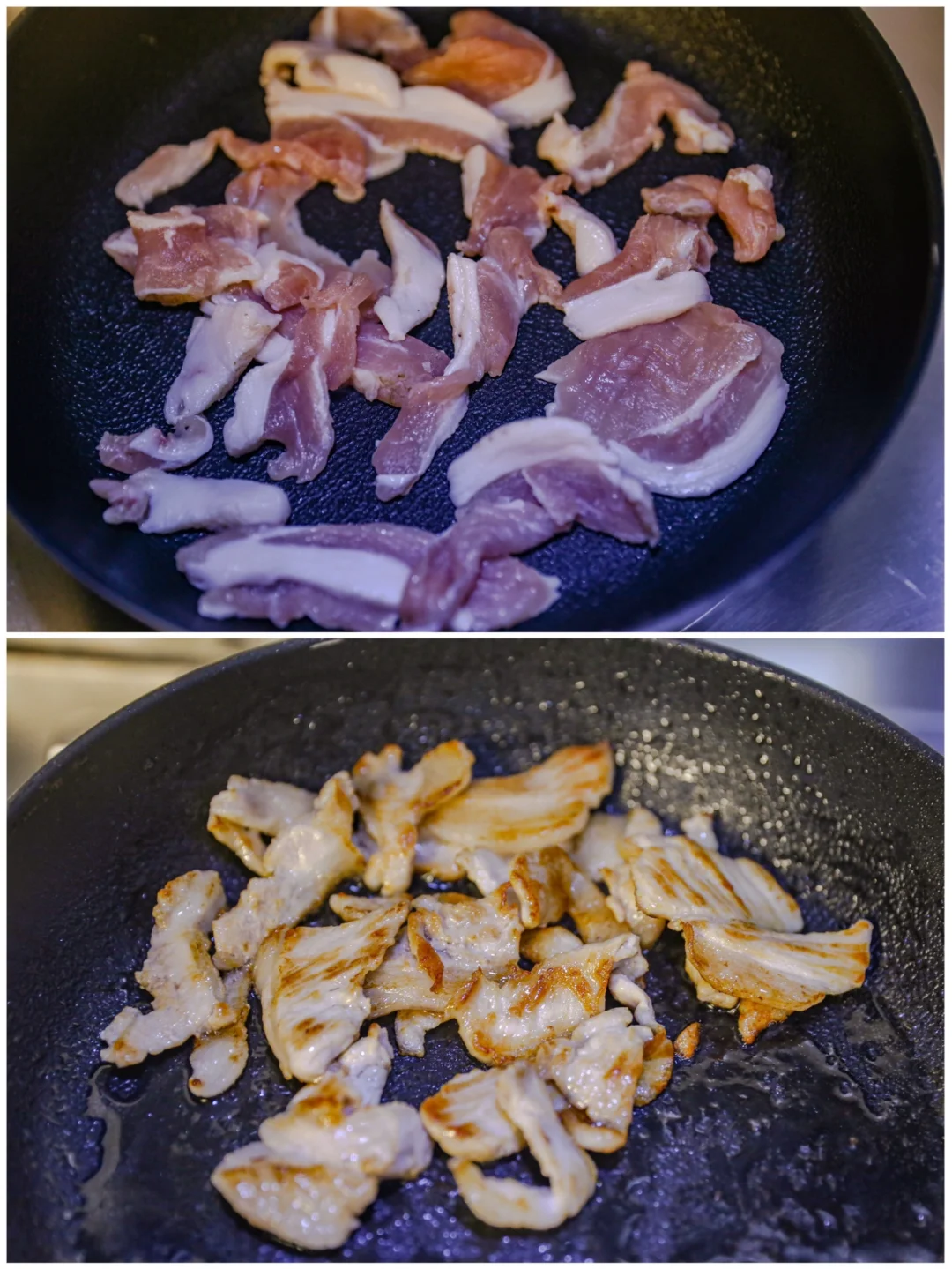 3.平底锅中放入五花肉,开中火煎到两面变色。