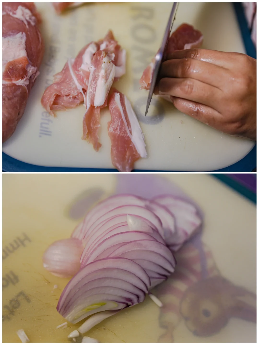 1.青菜处理,洋葱切成薄片,五花肉切成容易吃的大小。