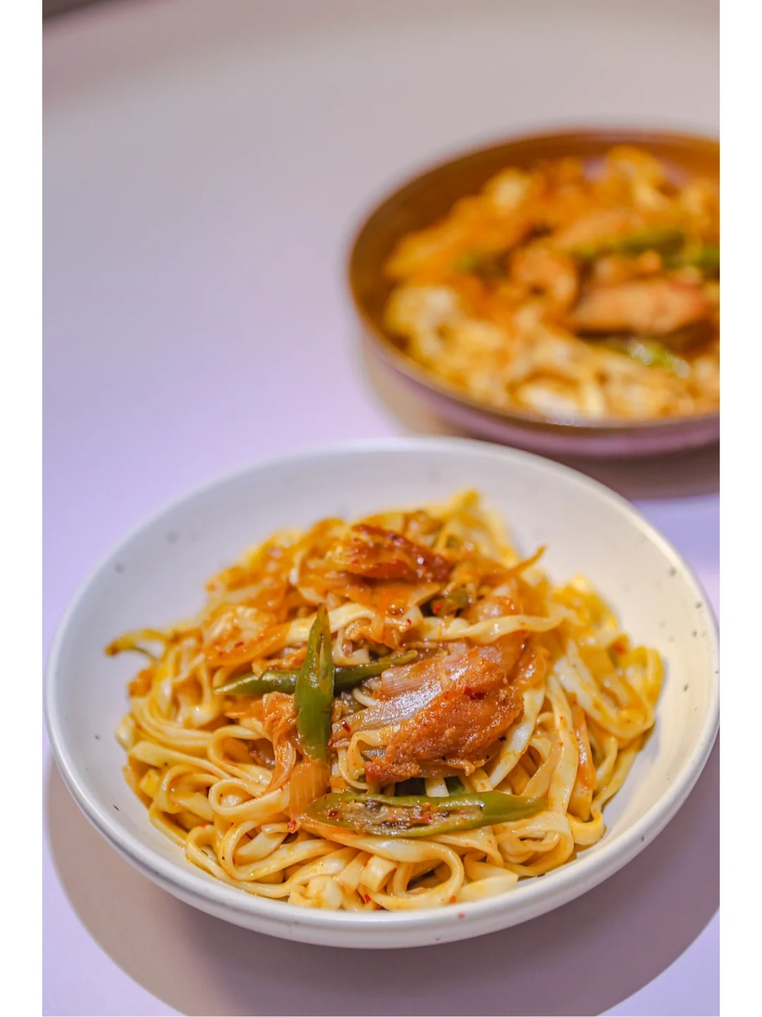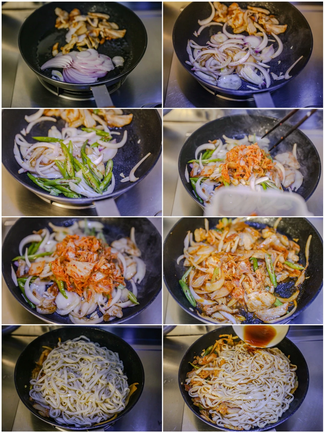 5.把五花肉移到一边,放入洋葱炒变色加入韩式泡菜。
