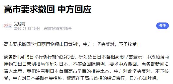 高市早苗再也控制不住自己的表情了,在采访时,她大声喊道:中国的行为是毫无道理的,日本不能接受中国的这种行为。 这番歇斯底里的喊话,哪里还有半分昔日政客的沉稳,分明是被现实狠狠戳中痛处后的慌不择路。 中方此前出台的两用物项出口管制,精准指向那些可能提升日本军事实力的用户和用途,不是笼统打压,而是精准划定红线。 这一管控戳中了日本产业的核心命脉。日本高端制造业和军工产业,对稀土等关键材料依赖度极高。从导弹制导系统到高端芯片传感器,都离不开这类特殊材料的支撑。中方几家国有稀土企业已暂停与日企的新合同续签,既有的合作也面临不确定性。 日本并非没有尝试过供应链替代。相关部门曾计划从澳大利亚、东南亚进口稀土,甚至探索深海开采和废旧设备回收技术。可这些方案要么成本过高难以量产,要么技术不成熟无法商业化,短期内根本无法填补缺口。 高市早苗政府曾寄希望于G7集体施压,试图将双边摩擦扩大为多边博弈。但G7内部立场本就不一致,欧美国家自身也依赖中方相关材料供应,压根不愿为日本出头,集体施压的想法终究落了空。 中方的管控措施有明确前提。此前高市早苗多次在涉台问题上挑衅,公然宣称“台湾有事就是日本存亡危机”,严重违背一个中国原则和中日政治共识。中方多次通过外交渠道发出警告,日方却始终拒绝撤回错误言论,反而持续推进强军扩武,突破专守防卫原则。 中国驻日大使早已驳回日方的无理交涉,明确指出中方措施合法合规,根源在于日方的错误言行。中方的管控不是贸易胁迫,而是履行防扩散义务、维护国家安全的正当手段,符合国际通行做法。 高市早苗的喊话更像是绝望挣扎。她的政府本想靠炒作“中国威胁论”转移国内矛盾,凝聚保守派选民支持。可现实是,中方反制已让日本旅游业、电子产业遭受实质损失,民众不满情绪持续上升。 日本国内反对声音持续高涨。多地民众举行集会,抗议高市早苗的冒险言论,担心其行为将日本拖入战争泥潭。社交媒体上,要求她撤回错误言论、辞职谢罪的呼声不断,甚至有民众直言她是“国难”。 多位日本前首相也公开反对她的政策,认为其言行轻率鲁莽,破坏地区和平稳定。就连她试图依附的美国,也没有给出明确支持信号,反而有政客刻意与她的激进表态撇清关系。 高市早苗看似强硬的姿态,掩盖不了内外交困的处境。对外,中方反制精准有效,外交交涉之路被彻底堵死;对内,经济损失持续扩大,民众信任度不断下滑,执政基础愈发不稳。 这场博弈的核心从不是口舌之争,而是战略主动权的较量。中方已不再被动应对日方挑衅,而是主动通过合规手段划定安全底线,将资源优势转化为规则话语权。 高市早苗的歇斯底里,恰恰说明日方已无力改变现实。若继续执迷不悟,坚持在敏感问题上踩线,等待日本的只会是更严厉的反制和更深的战略孤立。红线已划,侥幸无用,这是日方必须认清的现实。