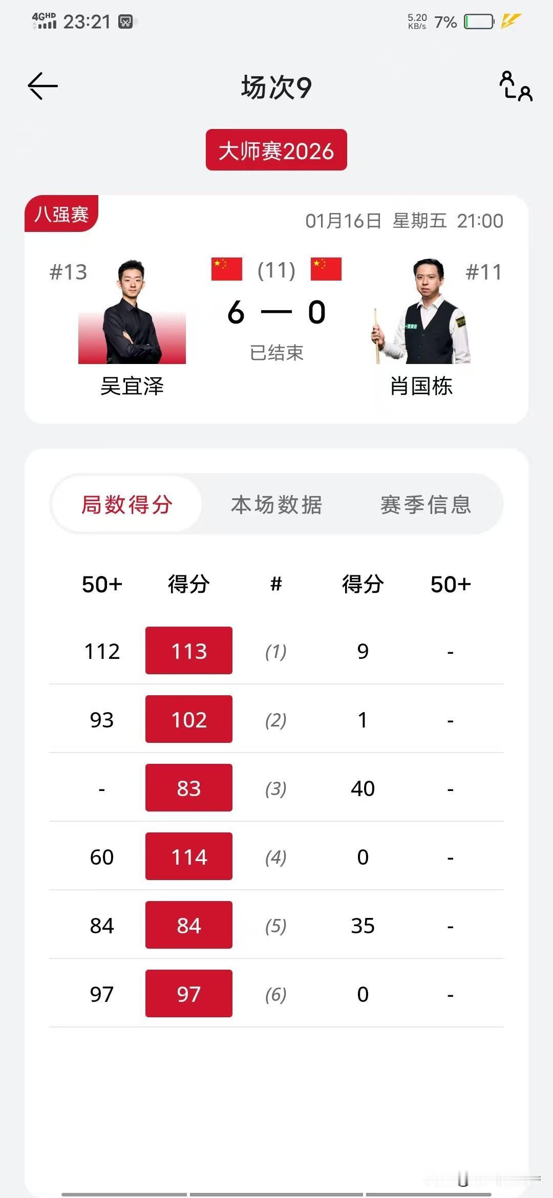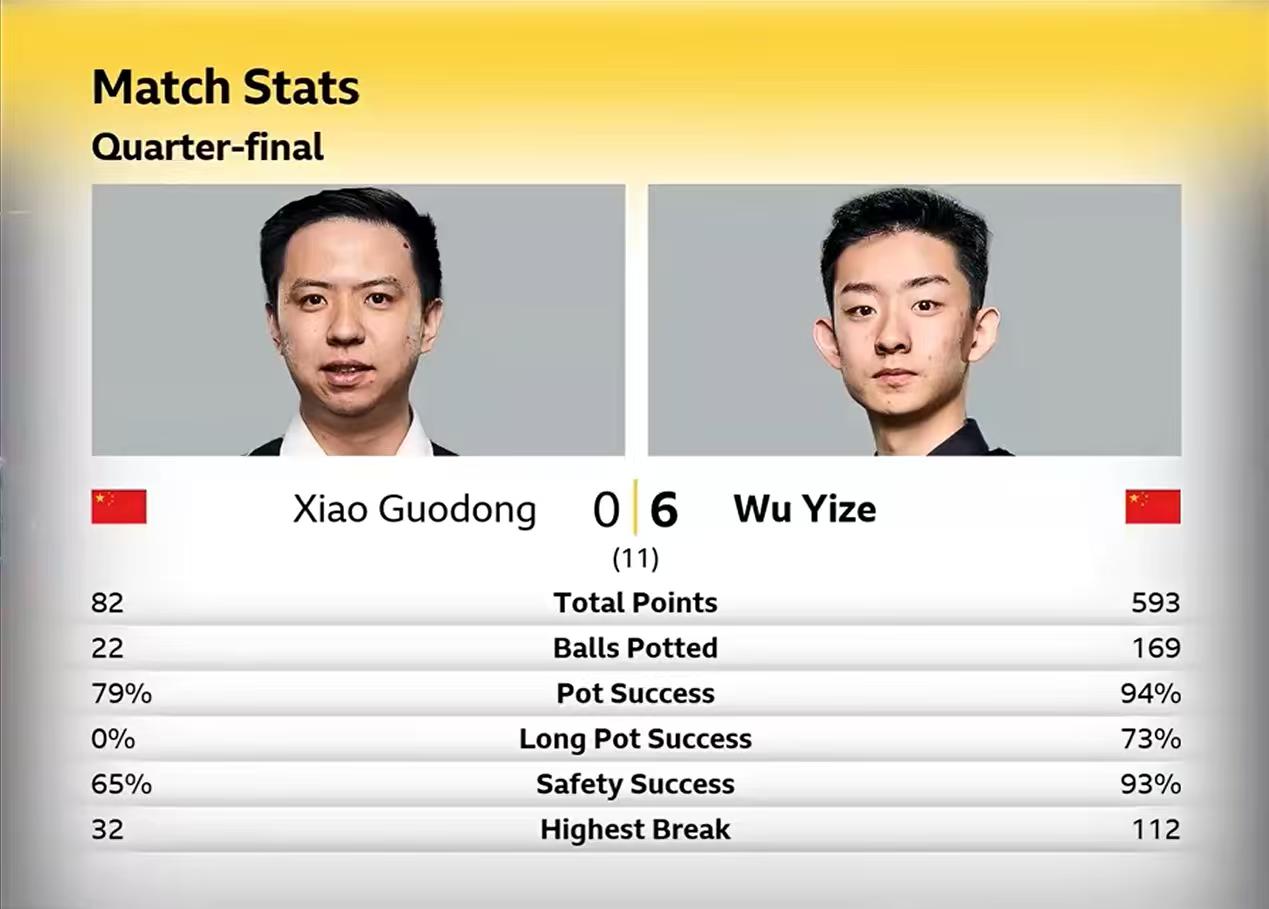来自兰州的台球狮子王吴宜泽,和来自重庆钢铁侠肖国栋在英国亚历山大宫展开对决。 结果出人意料,吴宜泽6-0横扫肖国栋晋级大师赛4强。 本场比赛肖国栋发挥非常糟糕,长台的数据是0,意思是一个长台都没打进。 反观吴宜泽打出豪华的数据,连续打出高分,防守也是不漏球。基本上拿到机会就一杆打死,如果中断也不影响连接。 赛后小吴表示,大师赛亚历山大宫,就是梦想中的比赛。自己就是享受比赛,打好每一杆。爸爸也给了自己惊喜,本来说半决赛再到英国,结果今天就到了,给自己带来好运。 赛场插曲,吴宜泽皮头出了问题,中途修了一下。吴爸爸是皮头专家,肖国栋的皮头也经常让吴爸爸换。 肖国栋昨天还在给吴宜泽下面吃,今天却0-6,不过我想肖国栋应该是恭喜吴宜泽继续高歌猛进。