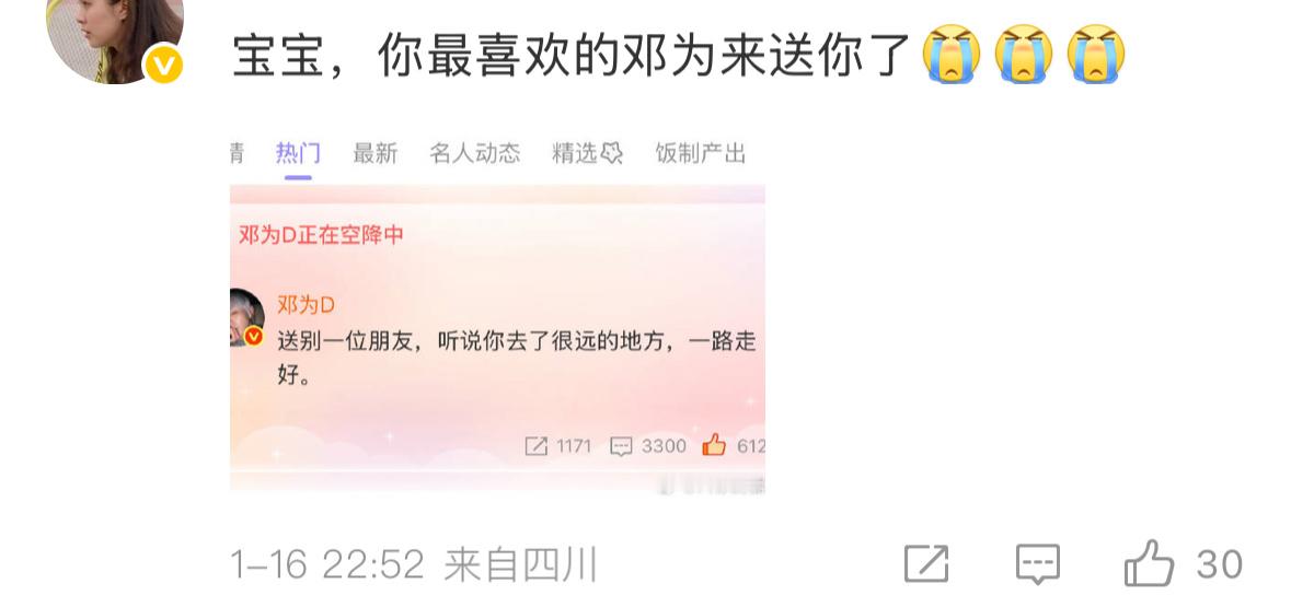 邓为发文:送别一位朋友宁宁,你最爱的邓为来送你了我真的爆哭了