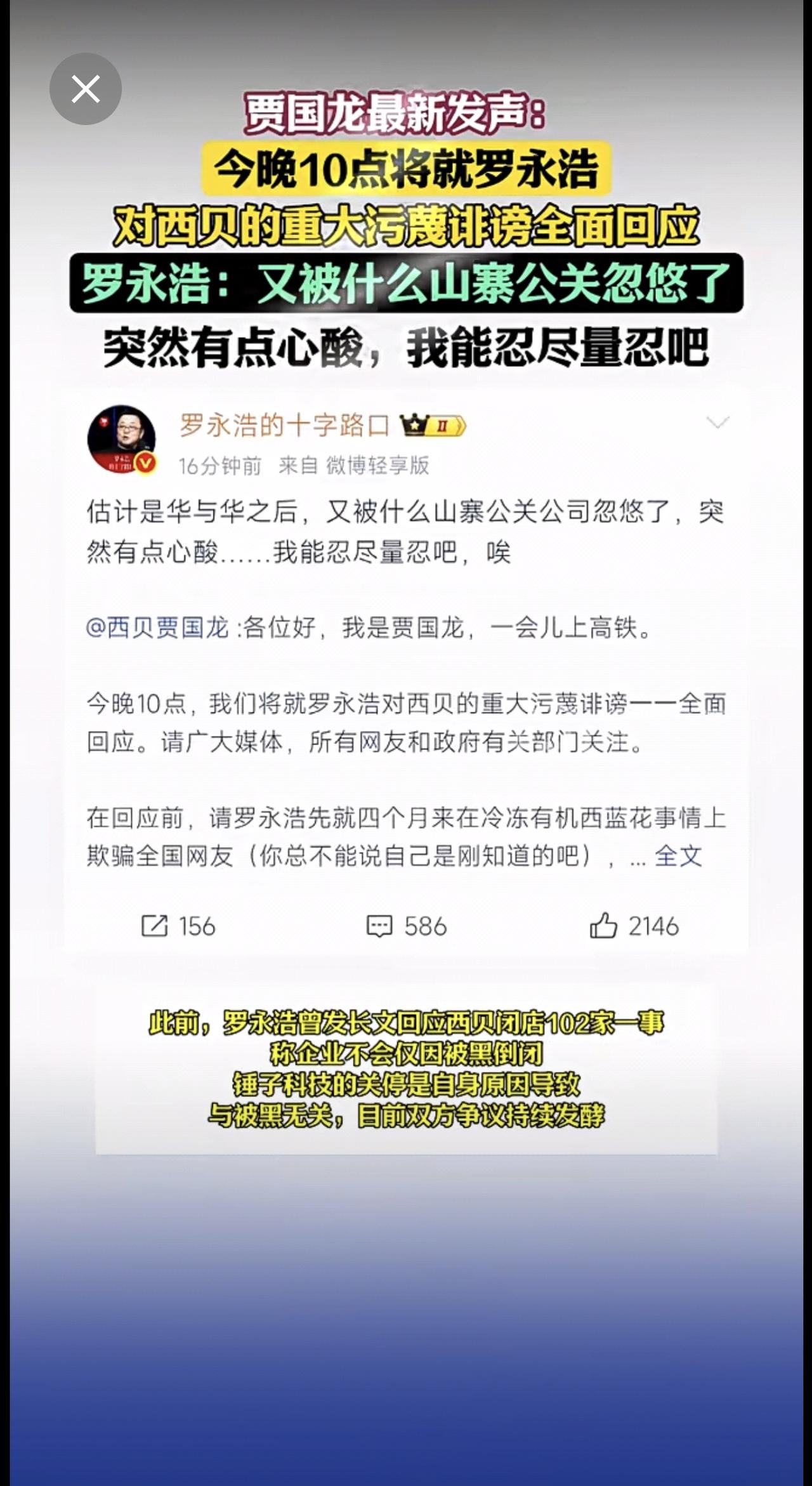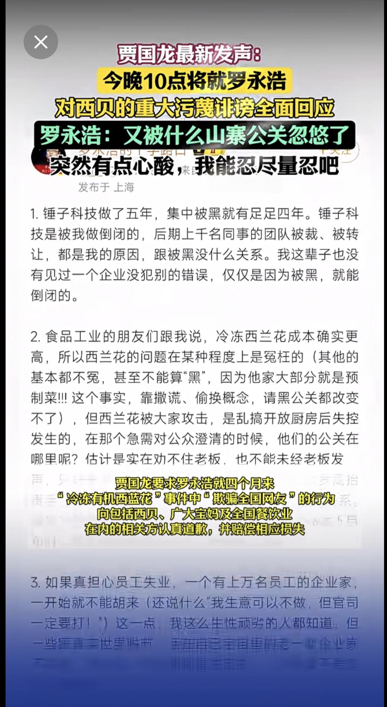 贾国龙最新发声:今晚10点将就罗永浩对西贝的重大污蔑诽谤全面回应,要求认真道歉并