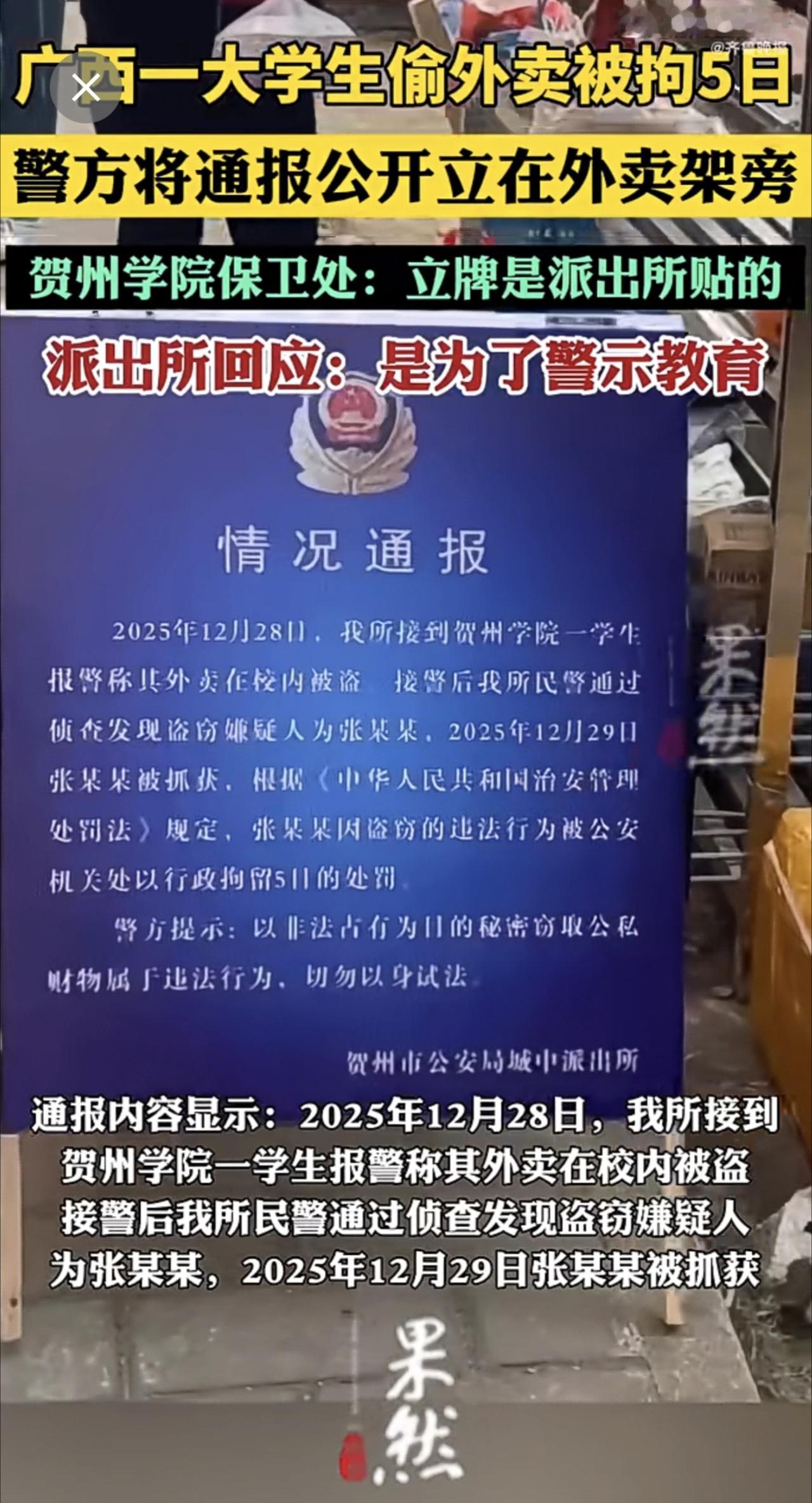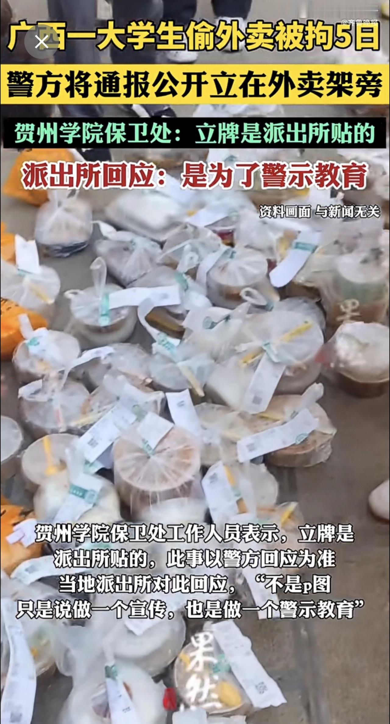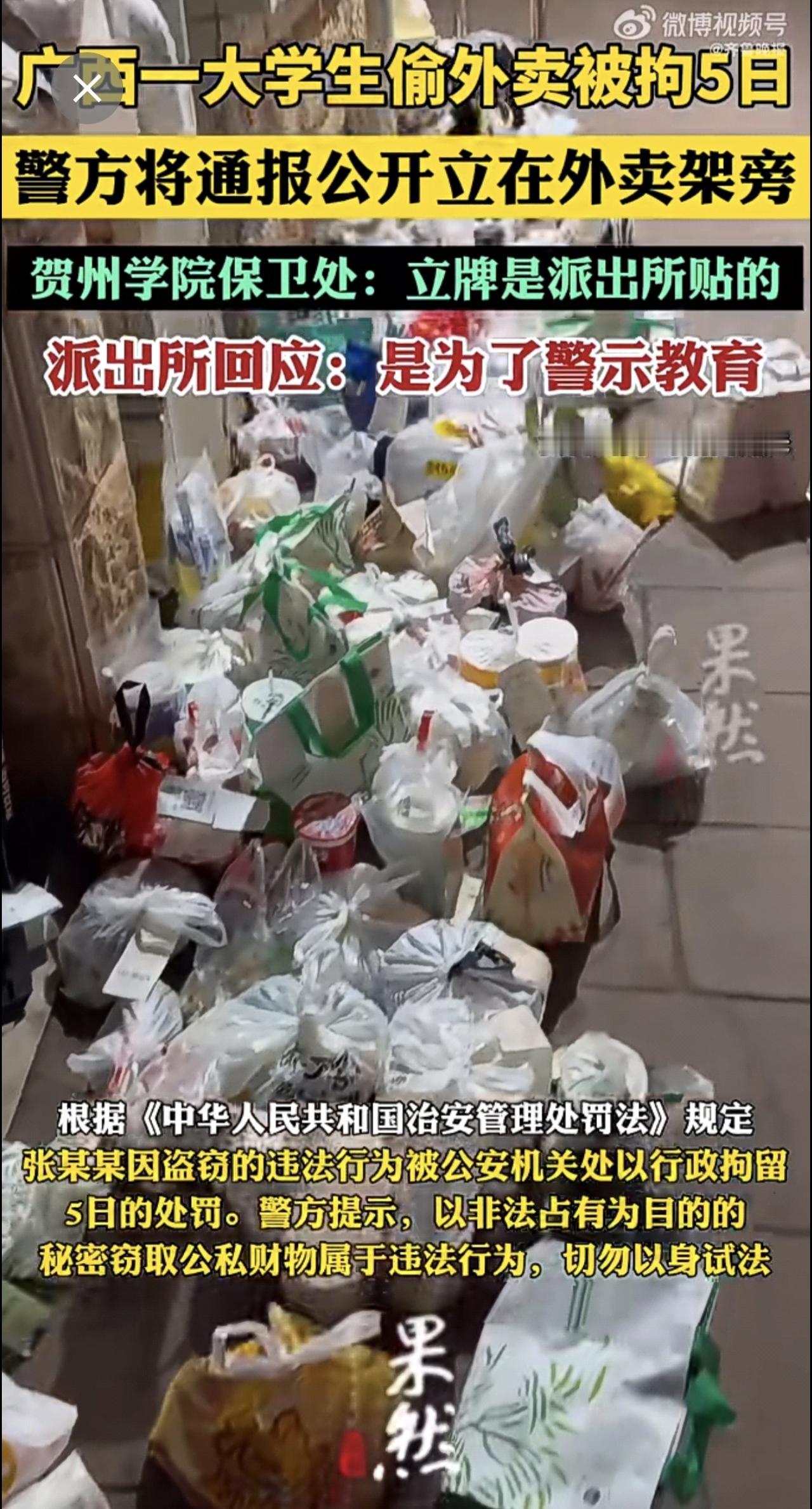 大学生偷东西有必要这么搞吗?广西贺州,一名大学生因为偷外卖,被行政拘留5天,并且