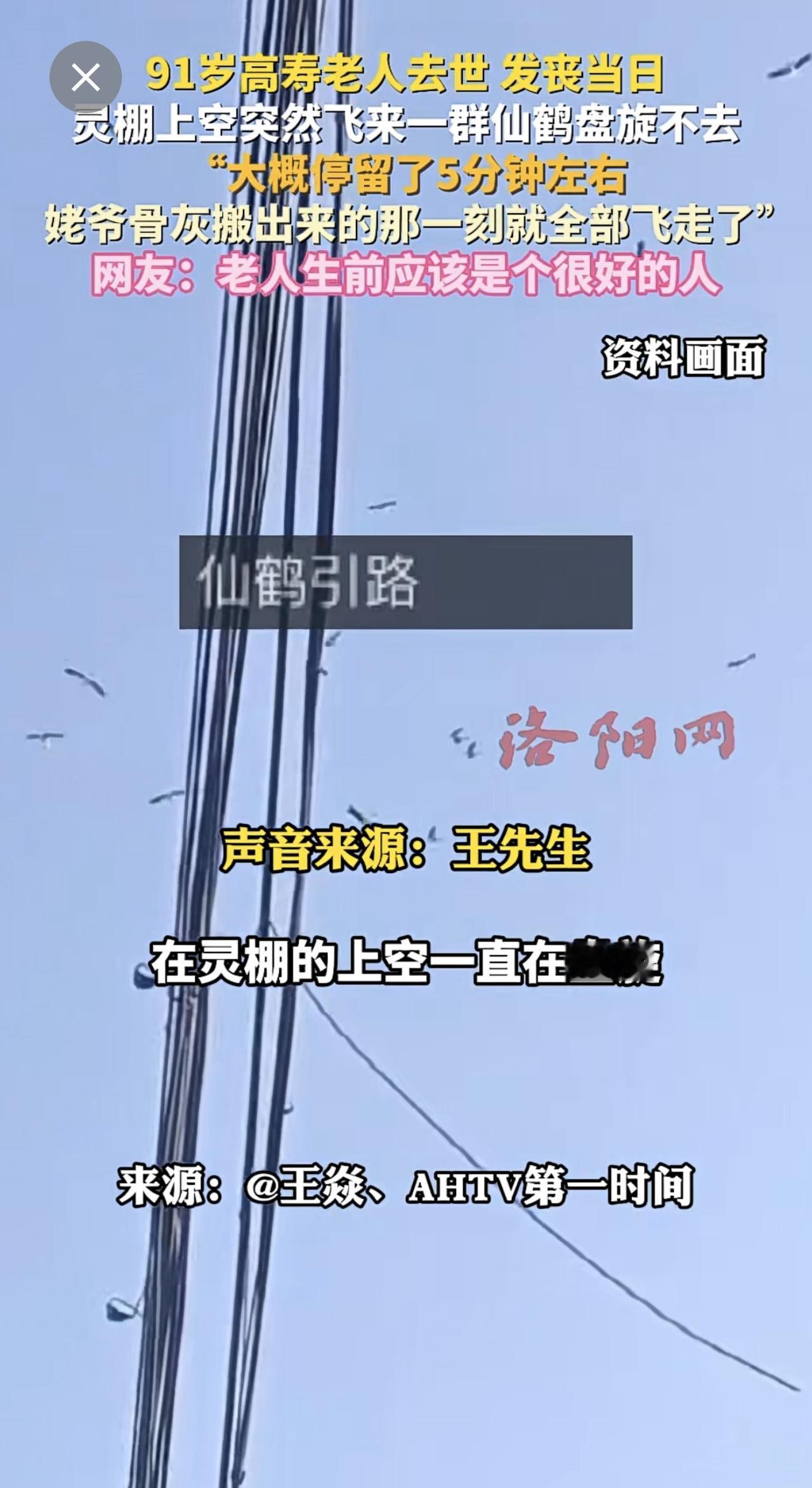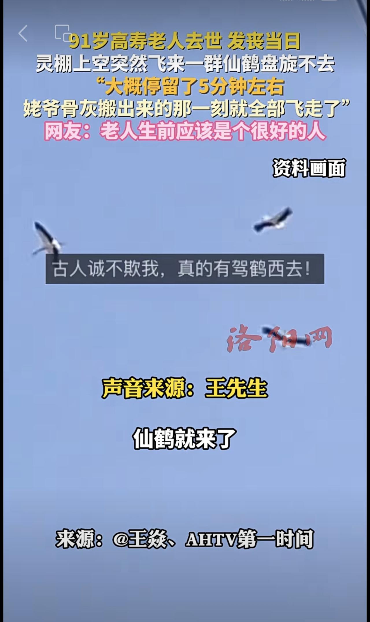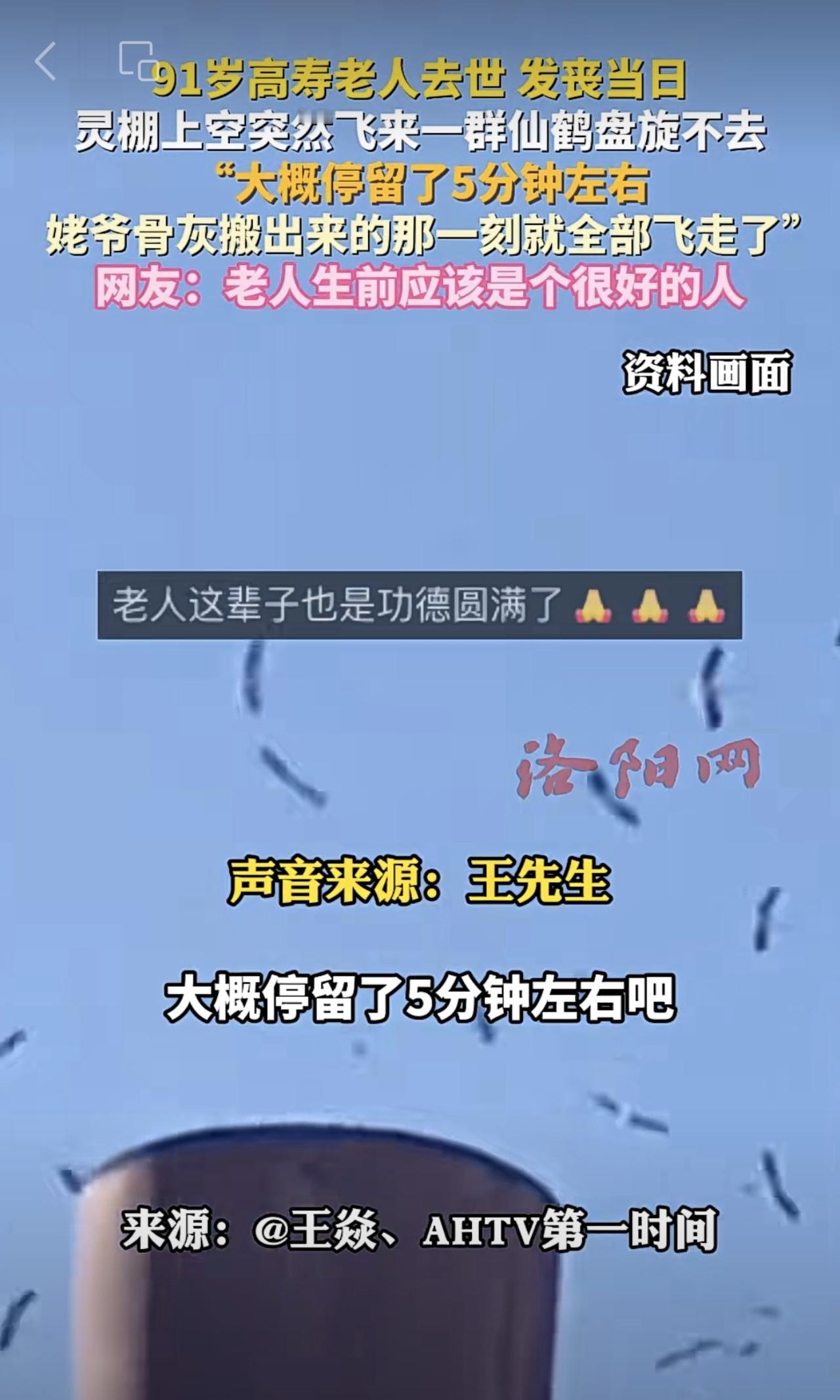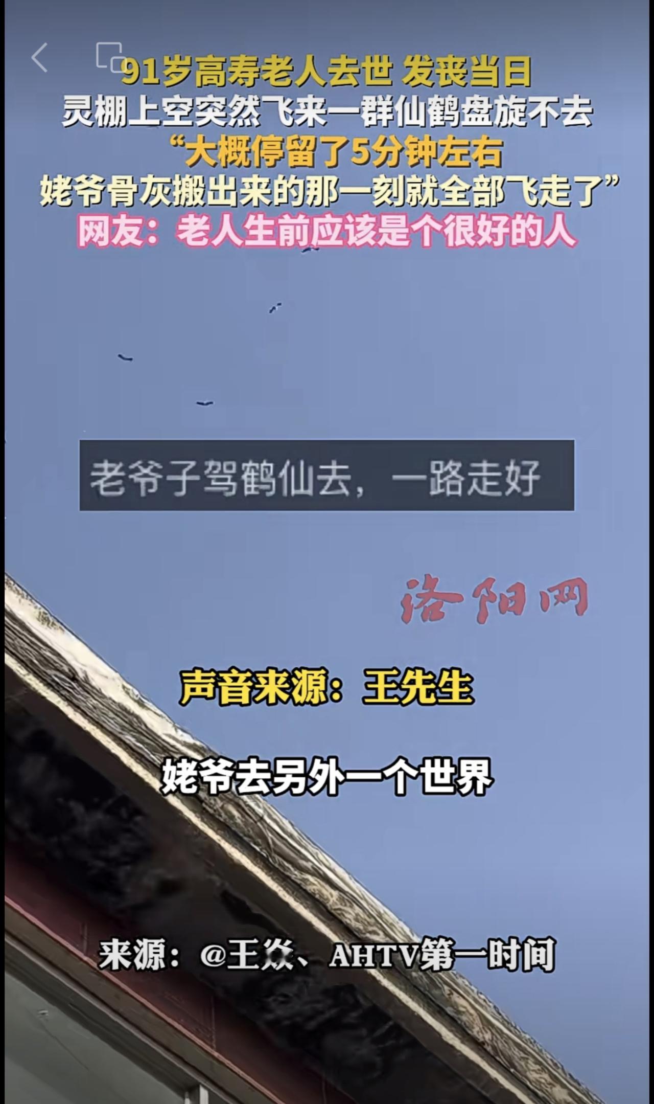 91岁高寿老人去世,发丧当日,灵棚上空突然飞来一群仙鹤盘旋不去,“大概停留了5分
