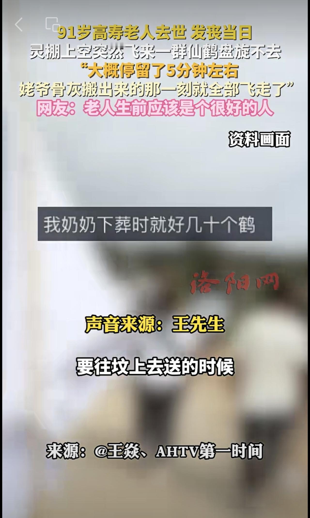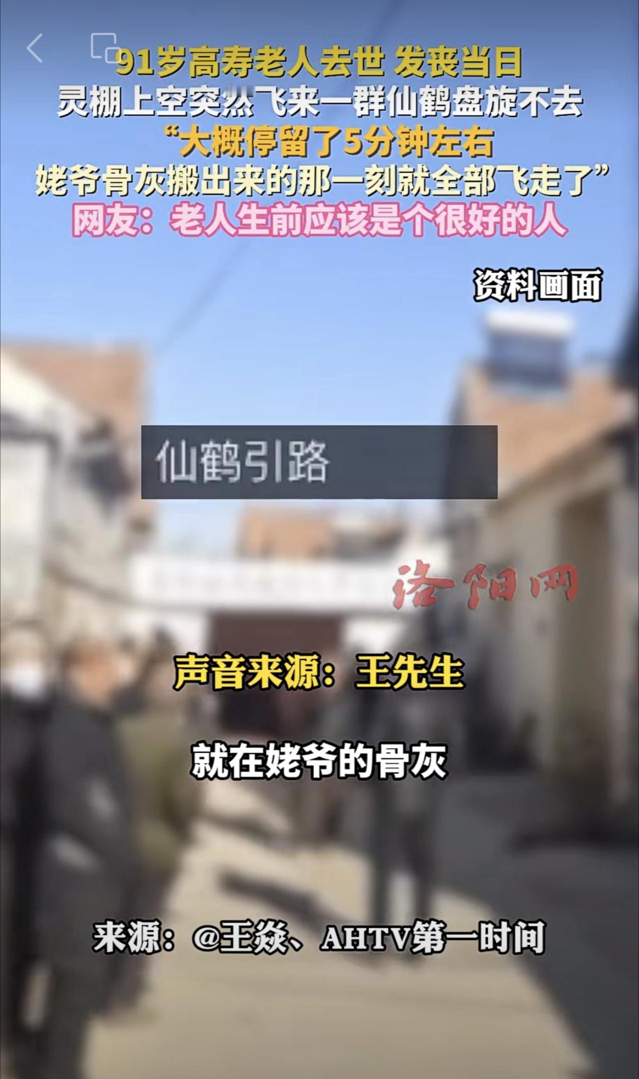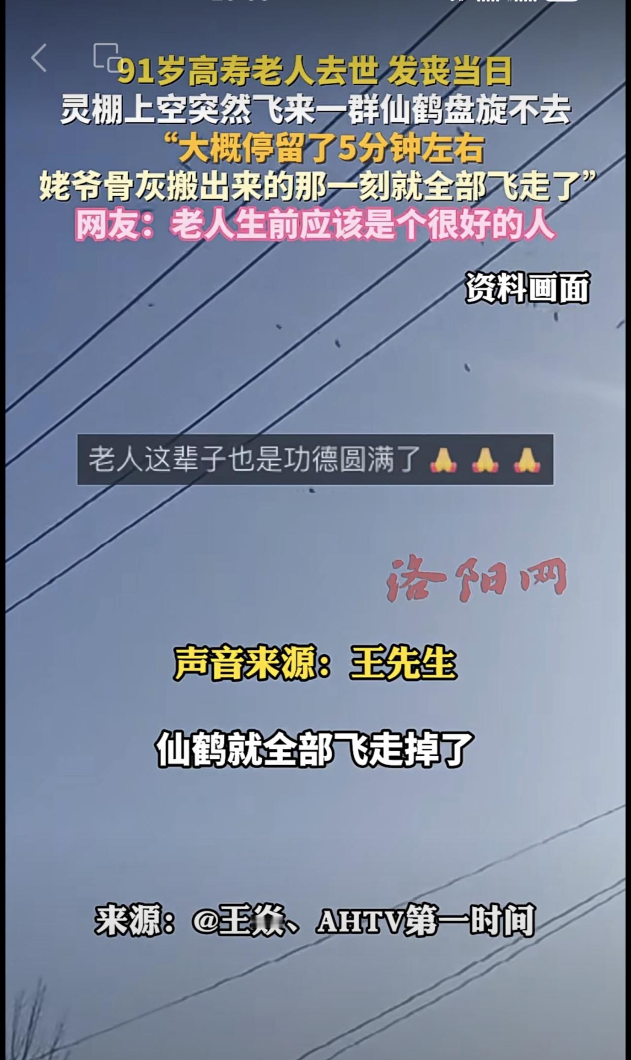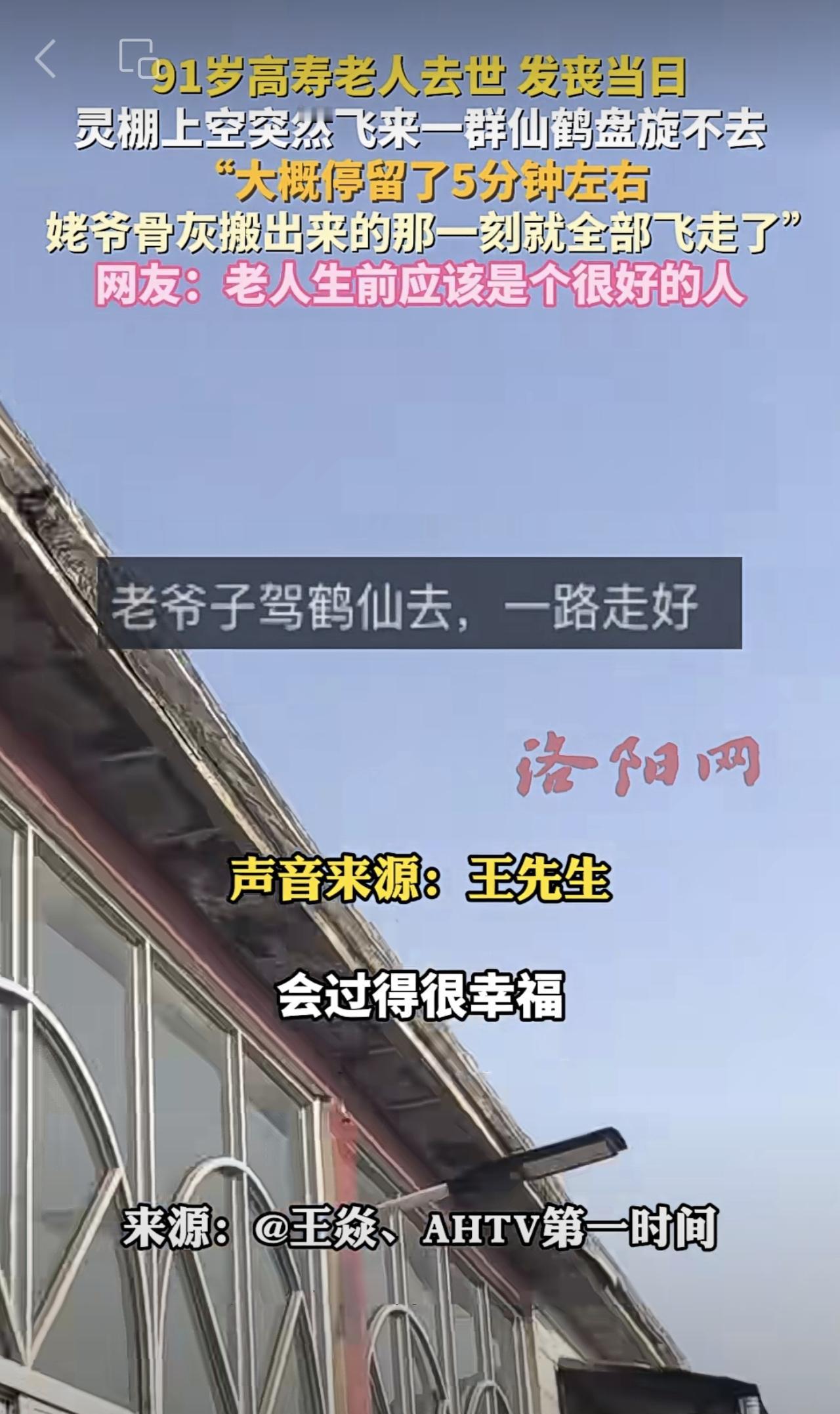 91岁高寿老人去世,发丧当日,灵棚上空突然飞来一群仙鹤盘旋不去,“大概停留了5分