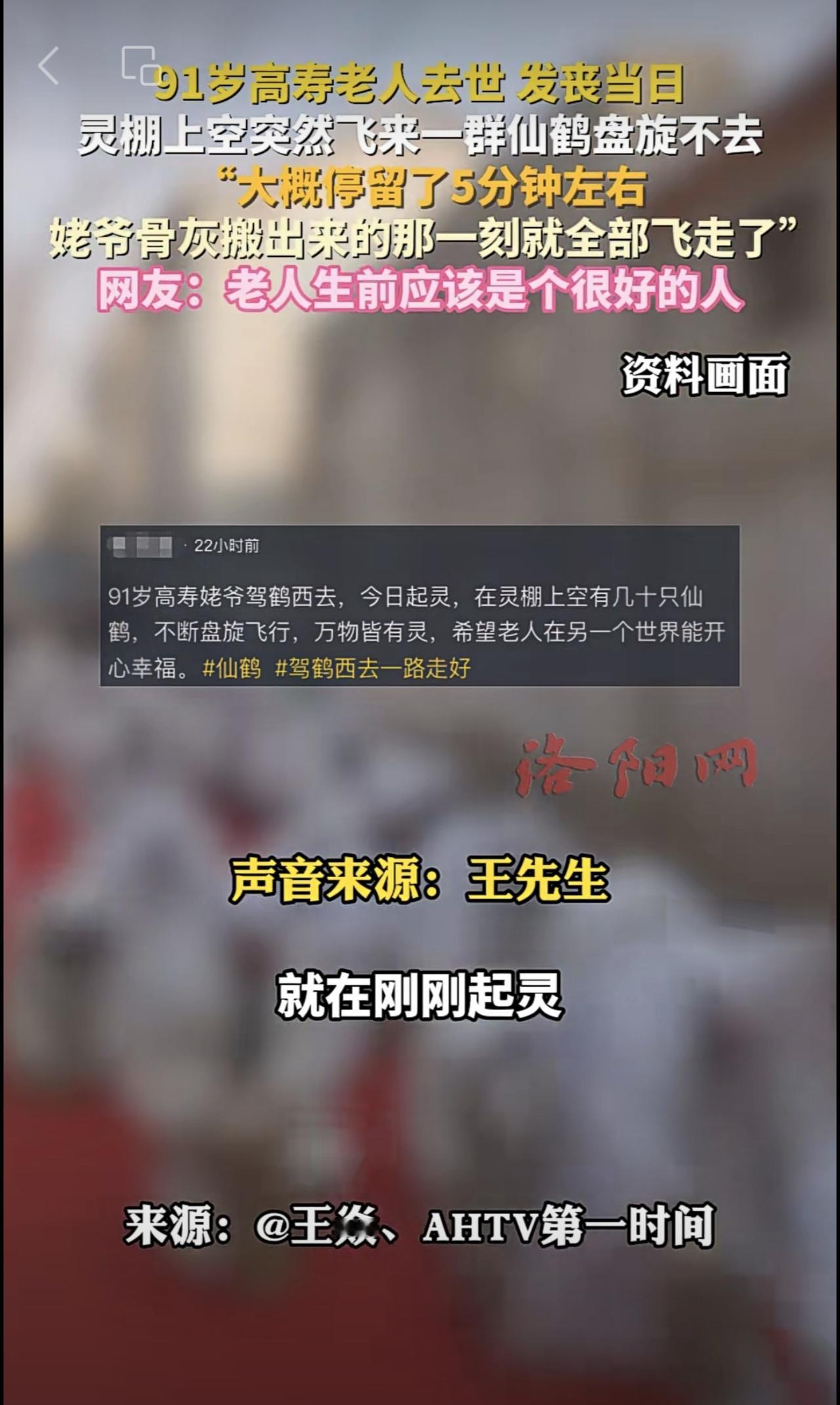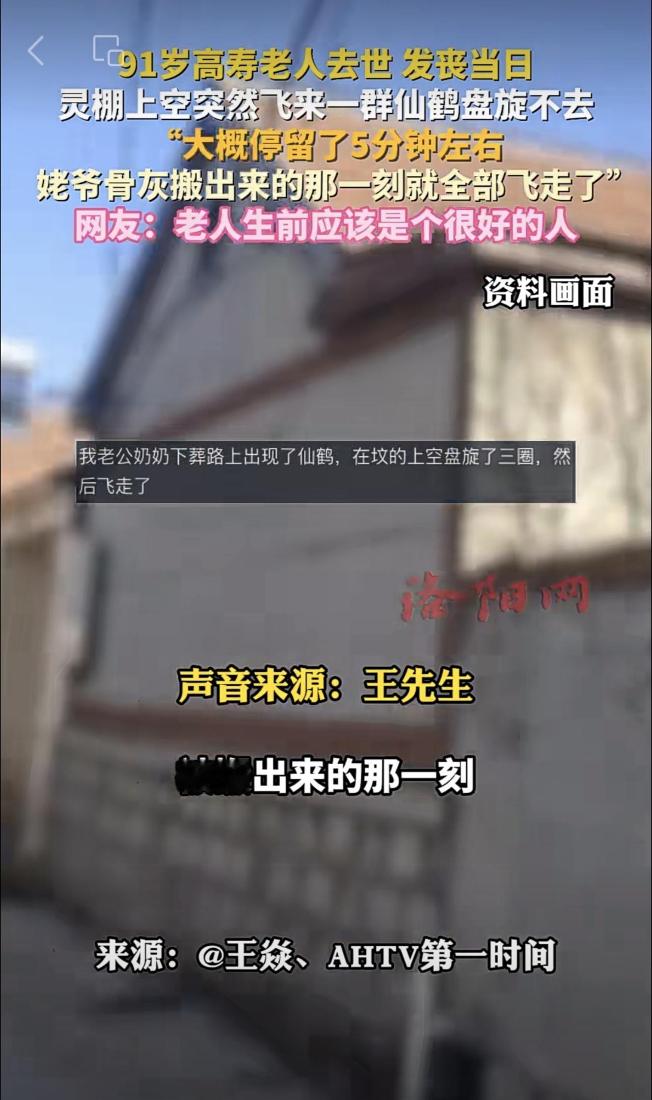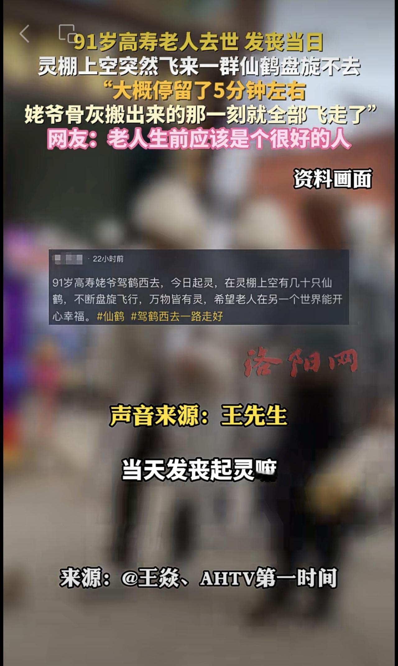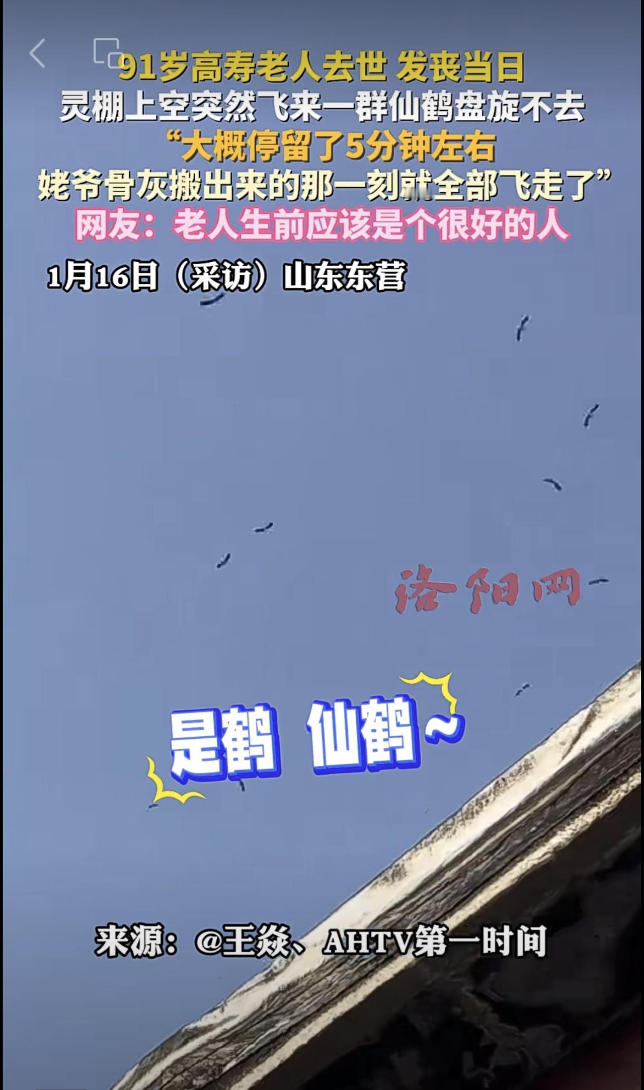 91岁高寿老人去世,发丧当日,灵棚上空突然飞来一群仙鹤盘旋不去,“大概停留了5分