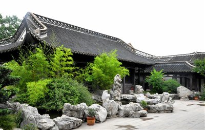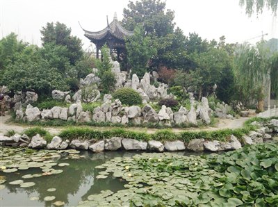 吴家后花园便是一部微雕式的《西游记》全景图。园内有一名为“灵根”的石块,竖立在走廊内,让游人感悟到佛祖就在面前。后花园,是一座文化丰厚、艺苑璀璨的长廊。登上一座假山上的亭台楼阁,俯视园中百花齐放,犹如步入天宫仙境,心旷神怡;登另一座土山,就像进入火焰山。淮安城里古老的涧河呈“人”字形,从此园流过,河上有两座小桥。如果细细品嚼,从这条小河上,体会到流沙河收徒、通天河取经的味道。河旁景致全是由石头镶成,河边小道由立砖铺就。从这些怪石嶙峋、层峦叠嶂中深感取经过程之艰险。细看这些奇石,一个个真像《西游记》中描述的妖魔鬼怪,有的像白骨精、有的像蜈蚣精、有的像牛魔王、有的像铁扇公主、有的像鲤鱼精……这些石头把书中的取经团队和反面妖神刻画得栩栩如生、淋漓尽致。孙悟空手持金箍棒腾云驾雾、铲魔除妖;猪八戒拿着钉耙盛气凌人、见义勇为;沙僧挑着担子忠心耿耿、保驾护航;唐僧一心求真经,胆小、软柔……