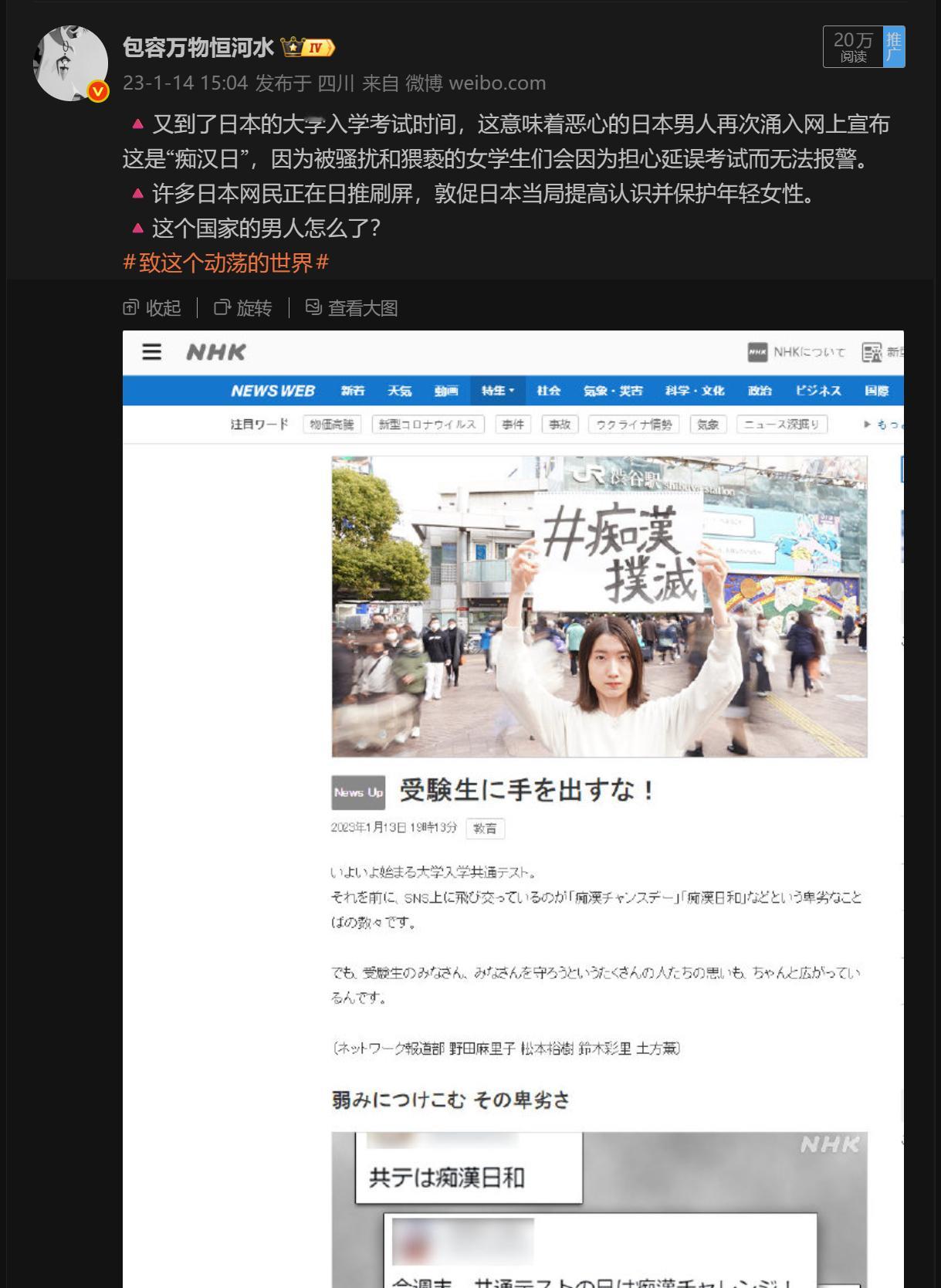 🔻这种事在日本甚至不是新闻,每年都有。🔻图1是我2023年发过的帖子。日本网帖煽动对高考考生性骚扰热点现场国际局势海外新鲜事