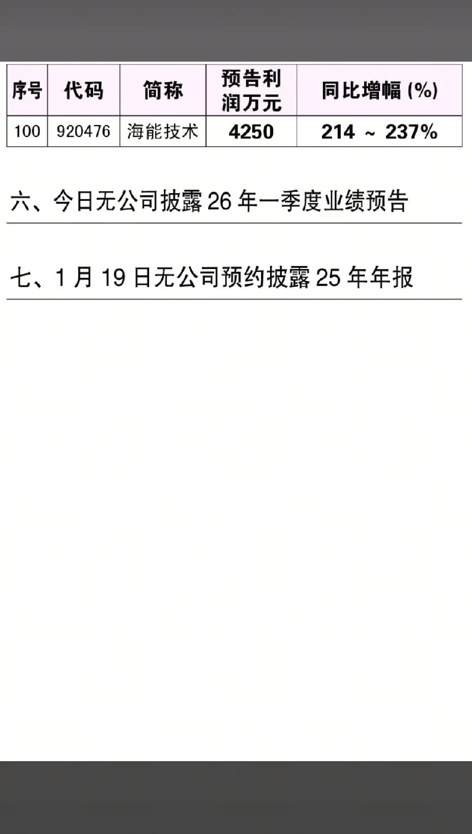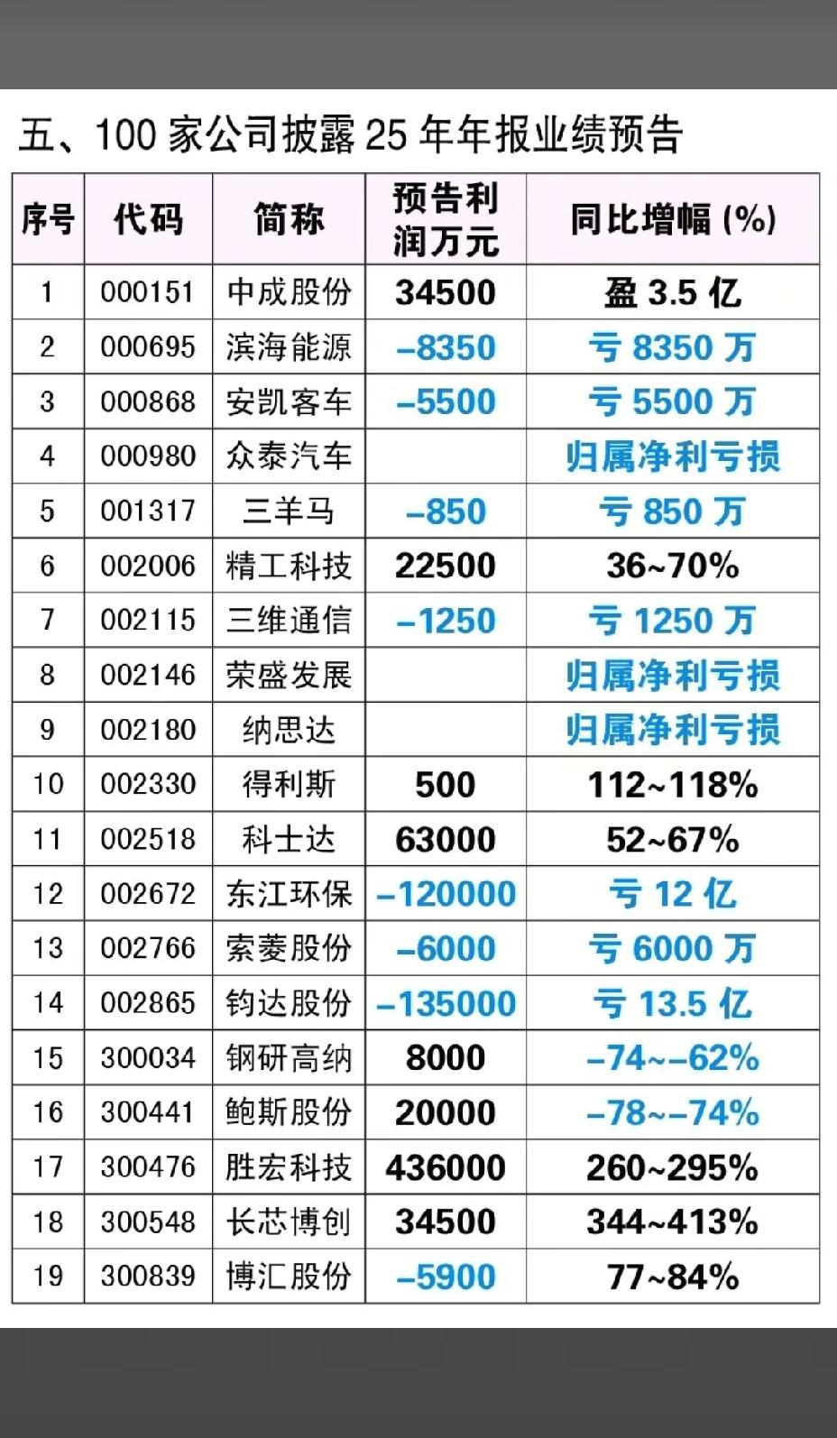 1月17日,下周A股这些股票有望大爆发!!! 2家公司将分红,重点关注:视声智能10派3 ,后市值得高看一眼;3家公司披露25年年报快报;100家公司披露25年业绩预告,重点关注:中成股份预计利润3.5亿,后市值得期待;长芯博创预计利润3.45亿,同比增长344-413%,后市值得重点关注!!!
