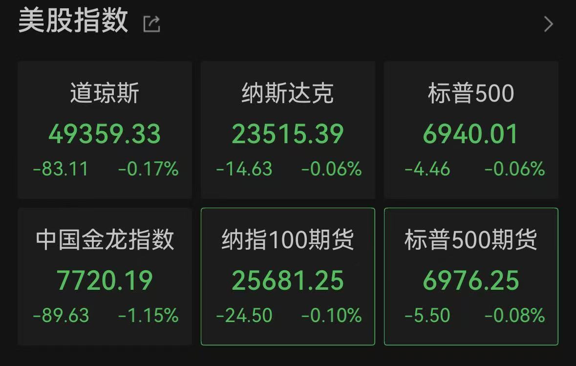 截至收盘,道指跌0.17%报49359.33点,标普500指数跌0.06%报6940.01点,纳指跌0.06%报23515.39点。本周,道指跌0.29%,标普500指数跌0.38%,纳指跌0.66%。
