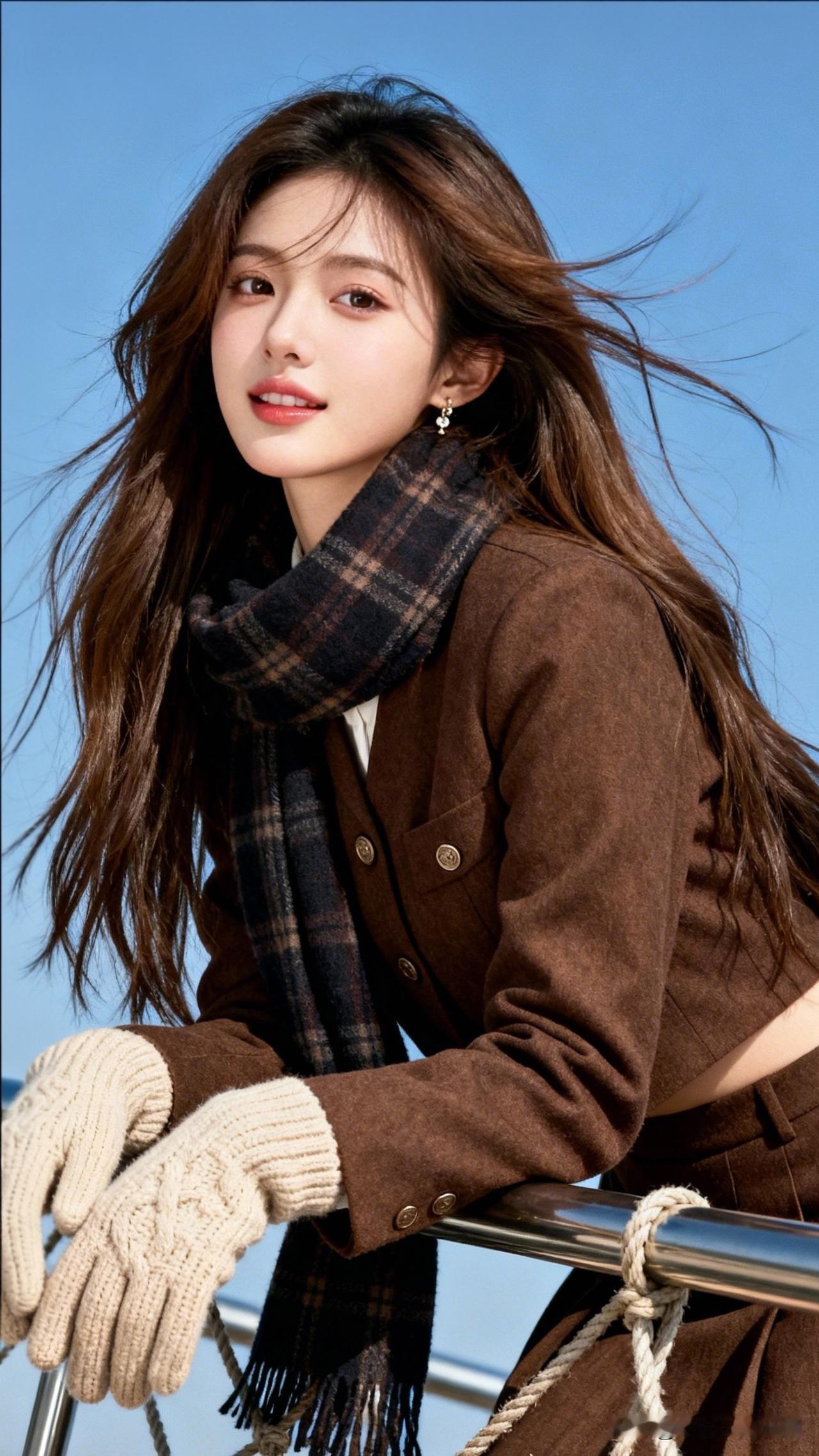 风起时,笑语盈盈。分享时尚穿搭心得 冬日暖阳下的甜美笑容,棕色大衣与格子围巾的完美搭配,温暖又时尚!🌞👗🧣