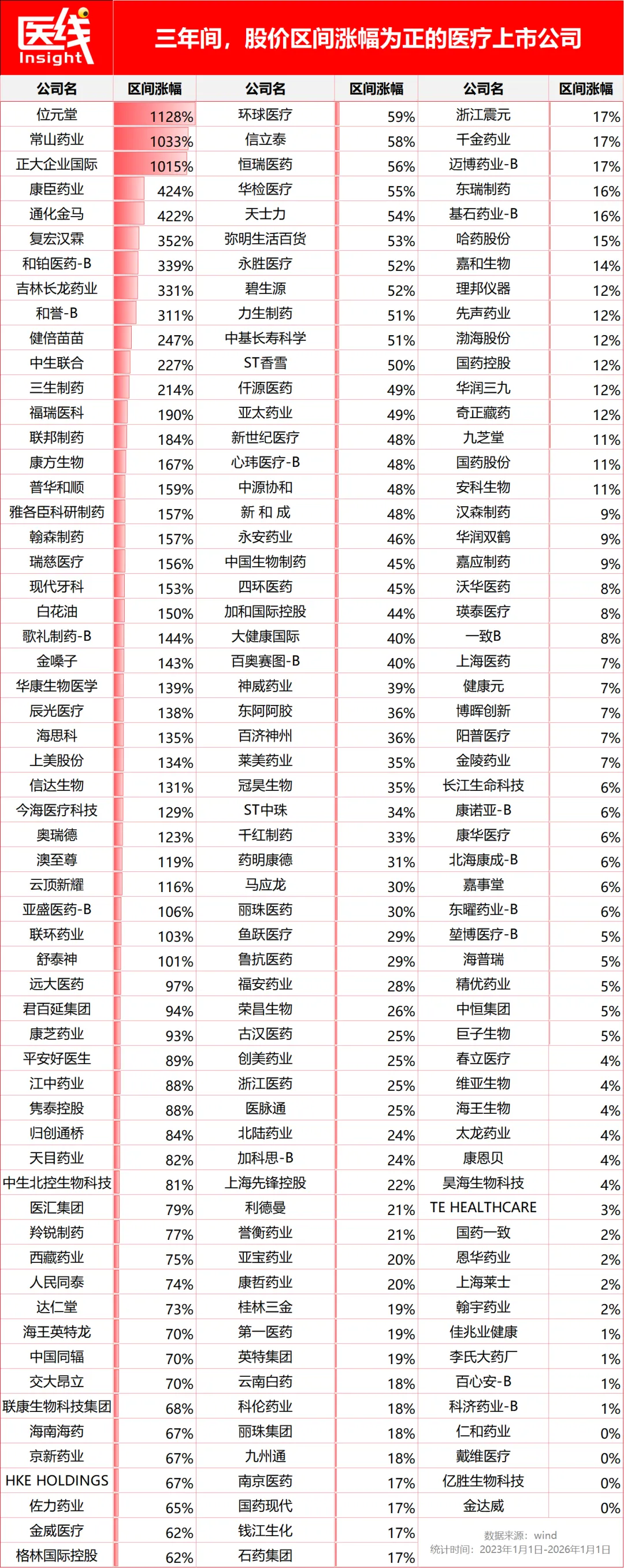 附:3年间中国医疗上市公司涨跌幅(前复权)情况