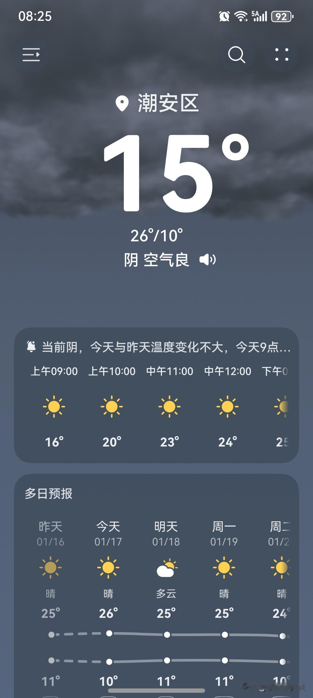 广东气温先升后降,下周冷空气来袭,气温大跳水! 17~19日,广东大部晴到多云,部分市县有零星小雨,气温总体趋于回升,昼夜温差大,早晚寒凉,另外大部分市县早晨有(轻)雾。 展望19日夜间较强冷空气入粤,20日自北向南影响全省,白天抵达中部,夜间南压至沿海。 今天(17日),潮州喜提一个多云天气,气温10~26℃,此刻气温15℃,体感温度13℃。 看看今天的天空!云量比昨天似乎又增多些,没有阳光灿烂,但从云层的缝隙中,倒是还能隐隐约约地看到一点点阳光。 气温方面又比昨天再上升了一点,看来今天依然是暖暖的一天啊! 白天气温相对来说还是比较高的,但早晚还是有点冷,外套还是要带上比较好,以防万一嘛! 昨天穿得有点多了,早上出门倒觉得还好。不过,随着气温的不断升高,等到中午,居然觉得有点热!什么高领打底衫太束缚了、靴子太暖和了、毛衣穿着也难受……各种嫌弃,但这些东西,在寒冷天气里,御寒效果可是相当地给力啊! 今天学聪明了,穿少一点,薄一点…… 这天气,有种为难穿衣选择困难症的嫌疑…… 不过,天气暖和一点还是比较好的。今天的天气,必须给个五星好评! 如此天气!元芳,你怎么看?