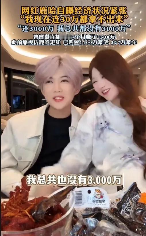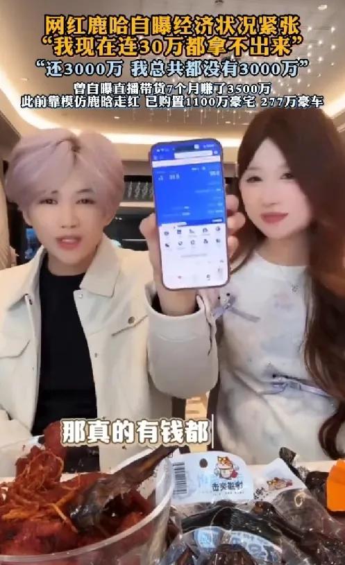 网红鹿哈自曝经济状况紧张! 网红鹿哈(凌达乐)因在直播中自曝“连30万现金都拿不出来”引发全网热议,他曾是“山寨男团”核心,靠模仿走红后转型带货,自曝月赚500万、买下千万豪宅。如今资金困局与昔日风光形成反差,他解释称资金都用于“压货”和公司运营。这揭示了网红经济在流量热潮退去后,普遍面临的变现不稳定与现金流挑战。网红鹿哈自曝经济状况紧张 鹿哈夫妇 小u哈直播 鹿哈集团 鹿哈模仿