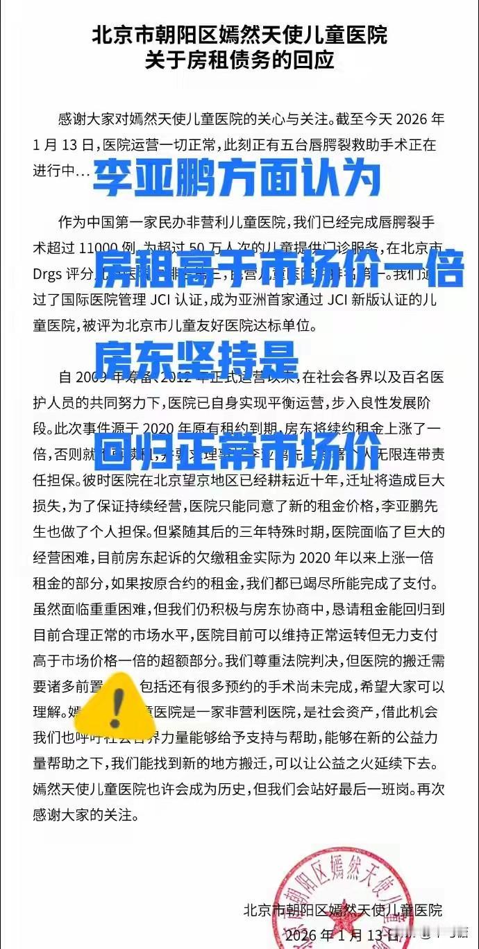 李亚鹏的房东认为涨价合理合法,且此前仁至义尽,除非李亚鹏为视频中的误导性言论公开道歉,否则绝不让步。 近日,李亚鹏的嫣然天使儿童医院面临付不起房租,将要关闭的状况,本意只是觉得房租太贵了,又是全公益医院,可没想到,一下牵动了全网,截止到目前,对李亚鹏的嫣然天使儿童医院的捐赠,一夜之间已经超过上千万的善款。 经过网友一顿查,天啊,李亚鹏的救助唇腭裂患者已经上万例手术,有的孩子已经接受了免费治疗6.7次,真的是公益项目,帮助了这么多的人啊。一个李亚鹏,一个韩红,还有古天乐是真金白银,真正闷着头做好事的人啊,这样的人怎么能让他输呢? 房东并非无情,即便在法院两审终审判决医院腾退房屋、支付约2600万元欠款后,可房东到现在都没强制清退,就是怕影响孩子们做手术。你说,这样还不算仁至义尽吗? 如今房东看到李亚鹏的房租言论后,认为涨价是按合同、按市场来的,没毛病。过去十年扶持,欠租后多次让步,仁至义尽。现在就想要个公开道歉,澄清那些误导人的话,不然这事儿真没法妥协。毕竟,公益是公益,租房又是另外一回事了。大家觉得谁有理呢?