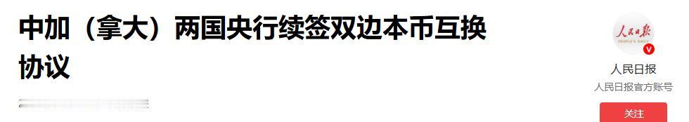 中加两国央行签订了双边本币互换协议,两国央行互相开了个“货币信用卡”,额度2000亿元人民币,有效期五年。 加拿大的油菜籽等农产品对华出口大幅下滑,本国经济受了不小冲击,偏偏这边还没缓过来,和美国的关系又出了大问题。 特朗普开启第二任期后,对加拿大根本没把盟友当回事,不仅频频施压,甚至公开表态想把加拿大并入美国版图,这让加拿大彻底慌了神,意识到不能再单一依赖美国,必须找新的合作出路。 于是新总理卡尼上台后,就把修复对华关系提上了日程,这次访华四天,核心就是为了拓宽经贸渠道,给加拿大留条后路,而这份货币互换协议,就是双方合作回暖的重要信号。 再说说这张“货币信用卡”具体怎么用,其实就是两国央行约定好,在需要的时候,一方能用自己的本币换等值的对方货币,主要用来结算双边贸易和投资,或者给金融市场补点短期流动性。 到期之后,双方再把本金换回来,用了钱的一方按约定付点利息就行。以前中加企业做买卖,大多得靠美元这类第三方货币结算,中间要经过好几次兑换,不仅麻烦,还得承担汇率波动的风险,说不定一笔生意赚的钱,最后全被汇率差价吃掉了。 有了这份协议,双方企业就能直接用人民币或加元结算,既省了兑换的步骤,又能稳稳规避汇率风险,对做进出口生意的商家来说,无疑是实实在在的便利。 这也是中国央行一直推进本币互换合作的原因,目前已经和全球32个国家和地区的央行签了协议,总规模大概4.5万亿元人民币,基本覆盖了六大洲的重点经济体。 2025年第三季度的数据显示,境外央行已经动用了793亿元人民币的互换资金,足见这种合作模式在促进贸易投资上的实际作用。 这次中加续签协议,不只是金融领域的合作,还跟着一连串经贸利好。中国承诺在今年3月前把加拿大油菜籽的关税降到15%,要知道中国可是全球最大的油菜籽买家,这对加拿大农业出口来说,无疑是解了燃眉之急。 加拿大也给出了回应,允许最多49000辆中国电动车以6.1%的最惠国关税进入本国市场。参考2025年加拿大电动车全年24.5万辆的销量,中国电动车凭这个配额,很有希望直接冲进销量前三,打开新的海外市场。 不过这份合作也不是没有隐忧,加拿大作为西方国家,虽然现在为了自身利益调整了对华政策,但能不能彻底抛开“抗中”叙事、摆脱美国的影响还不好说。 一旦美国对加拿大加大施压,卡尼政府能不能坚守合作立场,不重新沦为美国的“小跟班”,仍是个未知数。毕竟这份合作本质上是双方基于利益的试探,互惠互利才是能长久走下去的关键。 总的来说,这份2000亿元的“货币信用卡”,既是中加关系回暖的见证,也是双方应对当前国际局势的务实选择。它不仅能稳定双边贸易投资,还能让人民币在国际市场上的使用更广泛。 那么,你觉得这份协议能让中加合作稳步推进吗?欢迎在评论区留下看法。