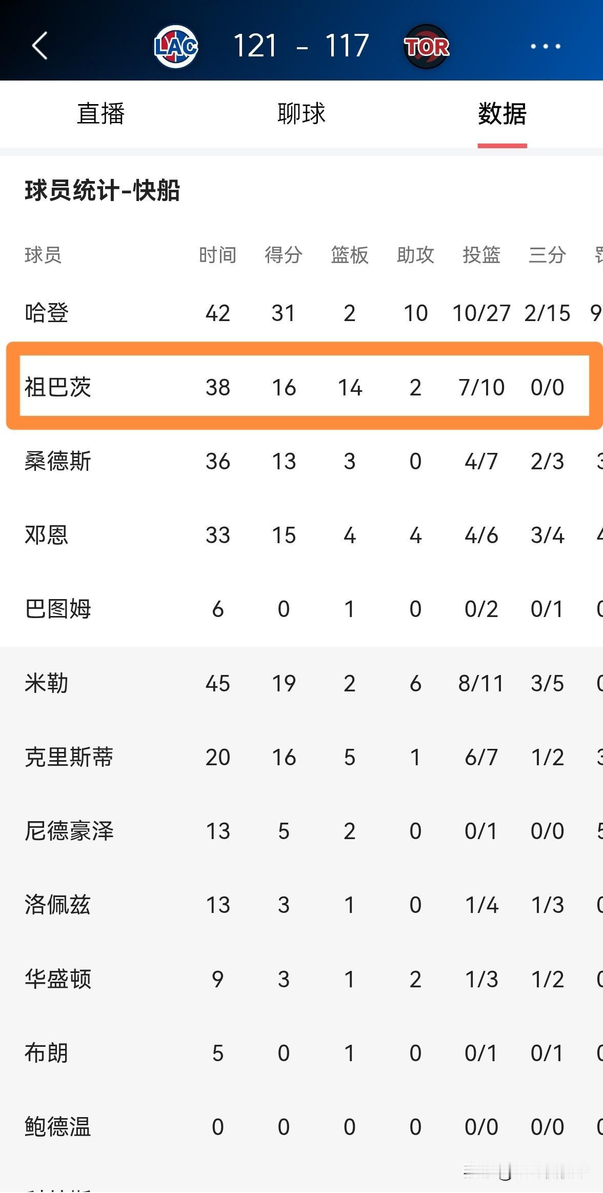 快船当家中锋祖巴茨狠狠地打脸了那些质疑者!在今天快船客场以121:117险胜猛龙的比赛中,祖巴茨首发出战38分钟,投篮10中7,其中罚球3中2非常高效的砍下16分,还有14篮板2助攻,他的场上正负值为+15。 事实证明,祖巴茨绝对是当今NBA性价比最高的中锋之一,本场比赛祖巴茨用自己的出色表现狠狠地打了那些质疑者的脸,我相信本场比赛过后质疑祖巴茨的声音会少很多。
