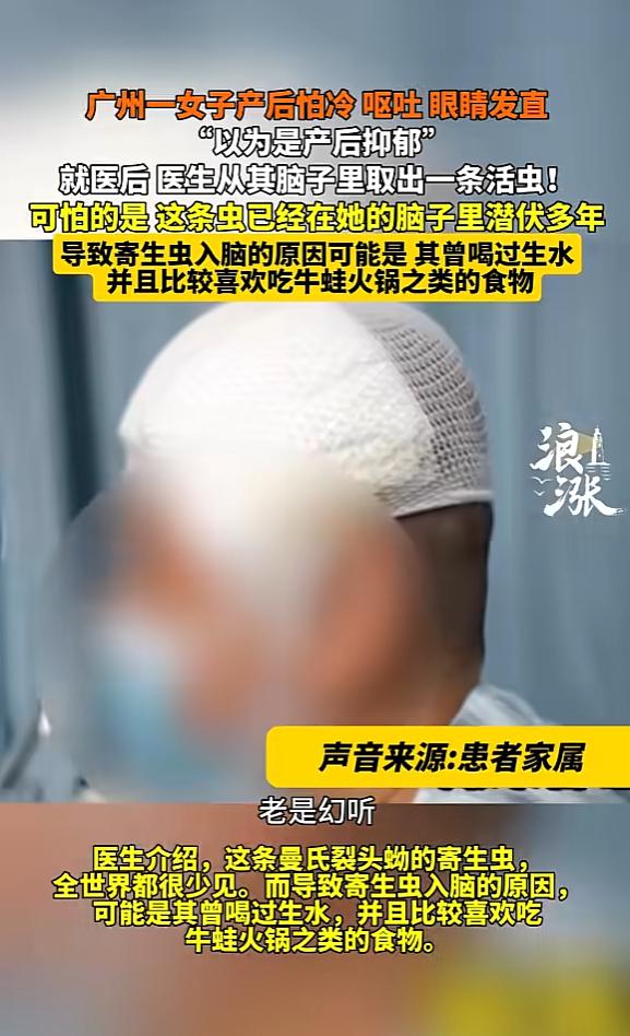 “悲剧还是发生了!”近日,广东广州,一女子产后突然怕冷,还经常呕吐,眼睛发直,家人以为是产后抑郁,结果去医院检查后,才发现她的脑子里有一条正在蠕动的活虫!更可怕的是,这条虫已经潜伏多年,一直在她的脑子里。网友:头皮发麻! 可随着症状越来越频繁,女士大半夜常常突然惊醒,浑身冷得像裹了层冰,紧接着就是止不住的呕吐,吐到最后意识都模糊了,眼睛直勾勾的看着特别吓人,家人这才慌了神,赶紧送她去医院检查,谁也没料到,这一查竟查出了让所有人头皮发麻的结果,医生通过影像发现,她的脑子里竟然有个活物在动! 后续的治疗过程想想就揪心,医生最终从她大脑里取出了一条还在蠕动的活虫,正是曼氏裂头蚴,更让人后怕的是,这条虫子并不是近期才入侵的,而是已经在她体内潜伏了好几年,悄无声息地在身体里游走,最后定居在了大脑这个最脆弱的部位,消息传出来后不少网友都直呼受不了,光是想想就觉得浑身不自在。 这事儿看着离谱却不是孤例,说白了就是咱们饮食习惯里的隐患没重视,才闹出的惊魂场面,之前浙江就有个男士,眼睛不舒服去检查,竟从眼球里取出了活虫,查来查去原因是他为了所谓的“明目”,生吞过蛇胆,还有四川的一个小姑娘,腿上长了个肿块,后来肿块破溃,居然爬出来一条十厘米长的寄生虫,追溯源头就是吃了街边摊贩卖的烤蛙。 更让人无奈的是,很多患者确诊后,根本想不起来自己吃了啥危险东西,在他们眼里那顿牛蛙火锅、一碗爆炒田螺,或是夏天图凉快喝的山泉水,都是再日常不过的事儿,当时压根没觉得有问题,更不会想到这些东西里可能藏着“致命隐患”。 其实曼氏裂头蚴这种寄生虫,大多藏在青蛙、蛇类的肌肉里,想要消灭它一点都不难,只要加热到56℃并保持五分钟,就能彻底杀死,可偏偏有人总迷信“七分熟才够嫩、够鲜”,觉得煮透了就丢了口感,非要冒着风险吃半生不熟的,殊不知用筷子夹起那块带血丝的蛙腿时,寄生虫幼虫可能正等着通过口腔伤口或消化道入侵身体,在体内游荡数月甚至数年,最后钻进大脑、眼球这些关键器官安营扎寨。 为啥这种“吃出来的病”屡禁不止?说到底还是侥幸心理在作祟,很多人都觉得“我这么吃好多年了都没事”“餐馆老板自己也吃,怕啥”“大家都这么吃,哪有那么倒霉”,可这些自我安慰的话,真等出了事,付出的可能就是开颅手术的惨痛代价,甚至是不可逆的身体损伤。 曼氏裂头蚴在大脑里游走时,会肆意破坏神经组织,很容易引发癫痫、偏瘫,严重的还会导致永久性失明,这些损伤一旦造成,就再也回不去了,好在广州这位产妇还算不幸中的万幸,虫子被及时发现并取出,没有造成更严重的后果,可还有不少人,长期把剧烈头痛当偏头痛,把肢体抽搐当缺钙,根本想不到脑子里可能藏着这样的“不速之客”。 病从口入这句话从来都不是空话,入口的东西真不能马虎。脑子里住进活虫不是玩笑,而是实实在在发生的悲剧,那些还执着于追求“嫩滑口感”,偏爱半生不熟食材的人,不妨多想想手术台上那条蠕动的活虫,你贪图的那一口鲜,可能正潜伏在体内,等着某天给你致命一击。 (信息来源:《女子产后怕冷呕吐眼睛发直"以为是产后抑郁"就医发现脑内活虫已"漫游"多年》浪涨新闻)