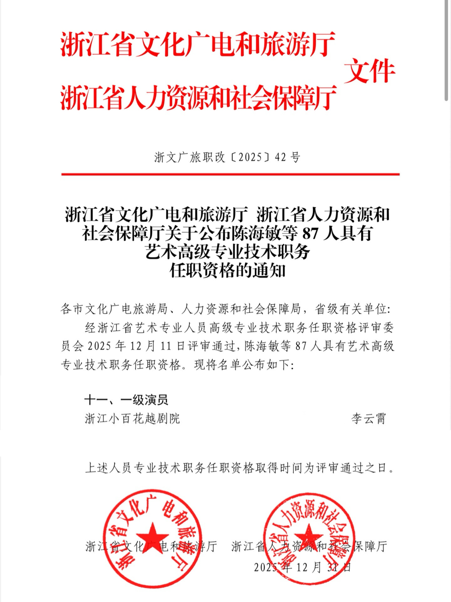 李云霄获评成为一级演员,正高职称🎉