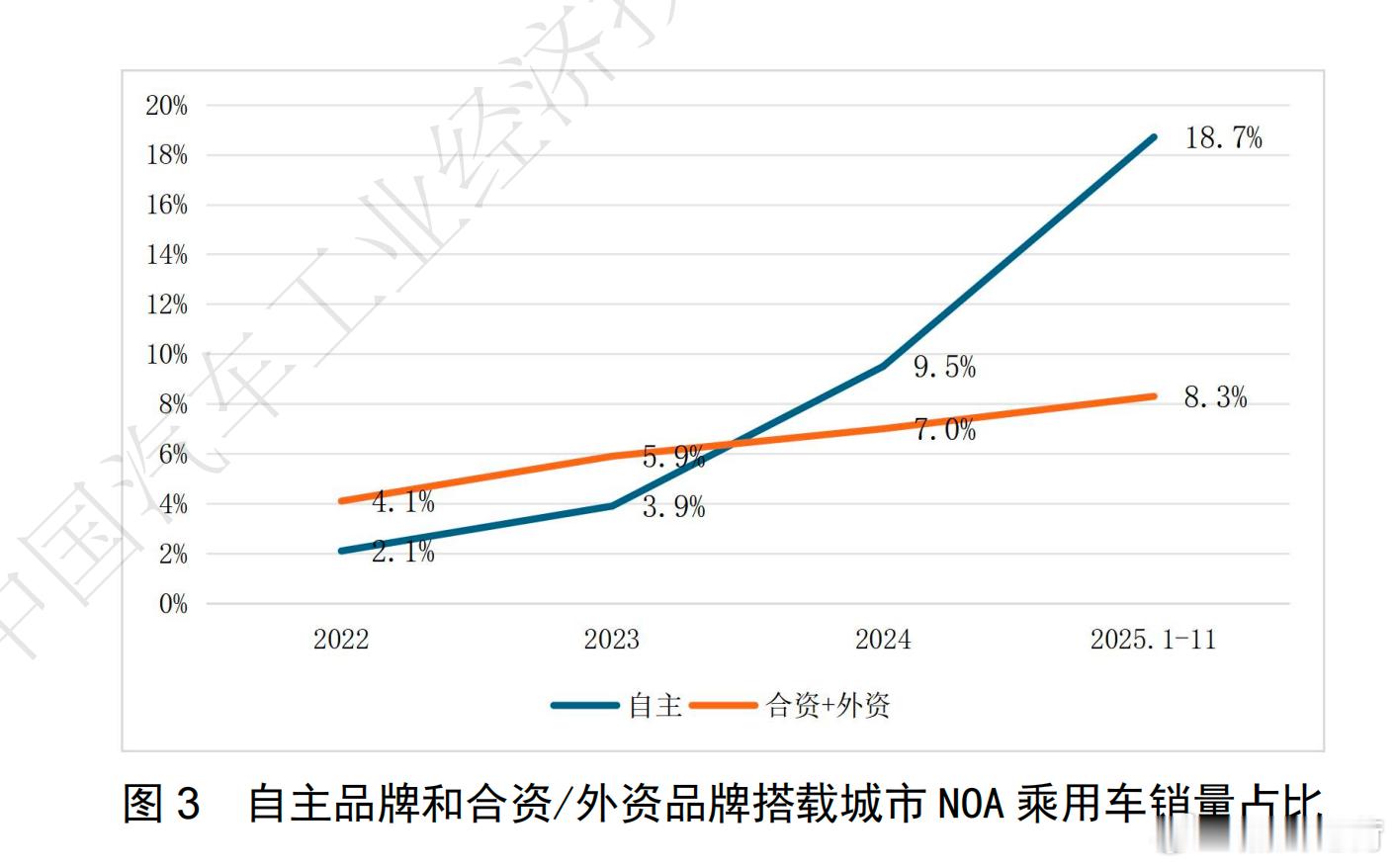 中汽协的这个报告有一些数据,很枯燥,但是很有意思。1、2025 年前三季度,驾驶辅助功能(L2 级)的乘用车销量增长 21.2%,渗透率 64%。2025 年 1—11月,有城市NOA的车销量312.9 万辆,增长5.6%;2、30万以下主流车型有城市NOA的占比68.9%;3、自研城市 NOA 车型销量约 245.1 万辆,占城市 NOA 总销量的78.3%,主导地位;自研企业主要有19家;4、城市 NOA 第三方供应商两家独大,Momenta和华为合计占比超80%(华为指的是HI模式,鸿蒙智行数据算自研);5、有城市NOA功能的销量中,自主品牌占比81.1%、而合资品牌占比仅为 8.3%;6、技术上,端到端、去高精准地图成为主流。报告并不算特别详细,尤其是在技术方面,从现有它总结出来的数据能看出。NOA和城市NOA的渗透率还在加快;2026年,15-20万价位的新车会是重点渗透区域;中国品牌在搭载城市NOA的意愿和动作上,更快、主动性更强,合资品牌刚开始起步。非车企的智驾企业中,Momenta和华为明显领先。