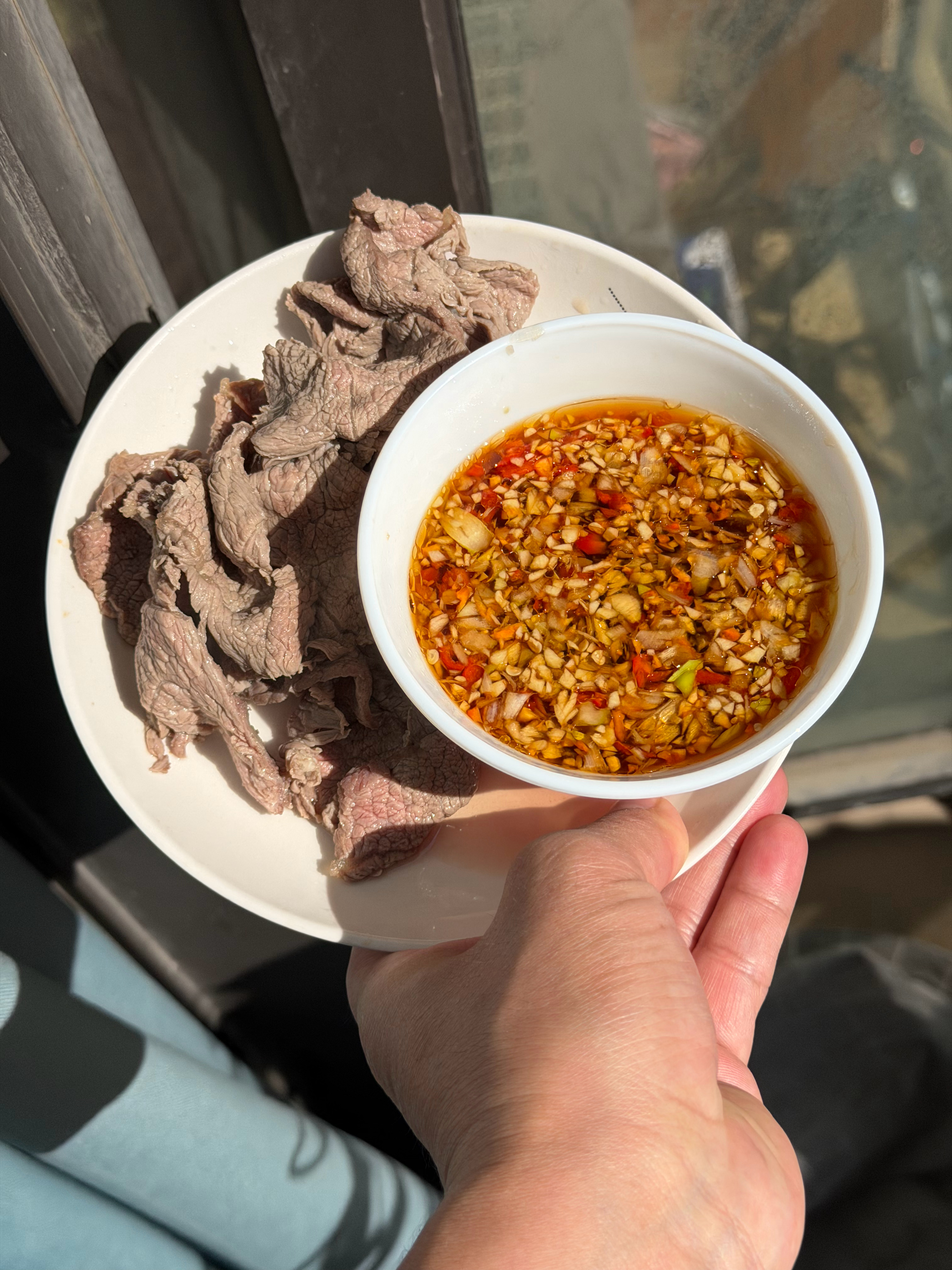 你买点牛肉(吊龙、肥牛),热水烫10秒,再整个料汁,蘸着吃,嘎嘎香
