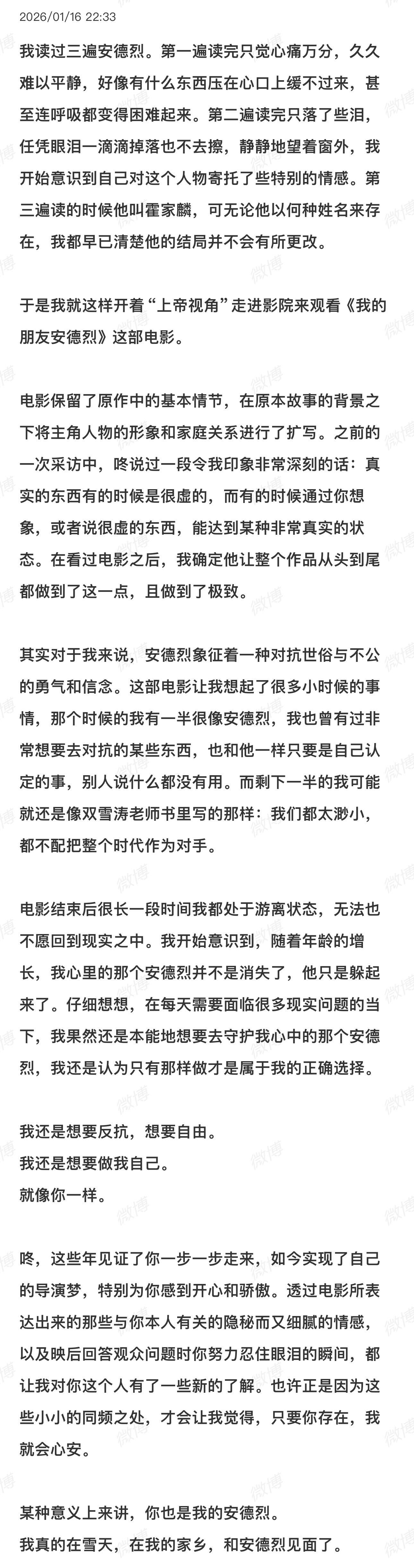 董子健好细腻的文字谁懂 一早起来看到董子健微博感觉好温暖🥹“最后的最后,现在是我们回忆里普通的一天,你终于醒啦。祝你早安,又是新的一天。^_^”董子健自己第一次做导演的电影《我的朋友安德烈》今天上映了,很细腻很温柔的文字,很多看过的观众反馈影片拍得也很真诚很用心,很多细节值得反复品味,像是进行了一场迟到多年的、温柔的和解。影片今日上映,看反馈是我喜欢的类型,一定会去看看的