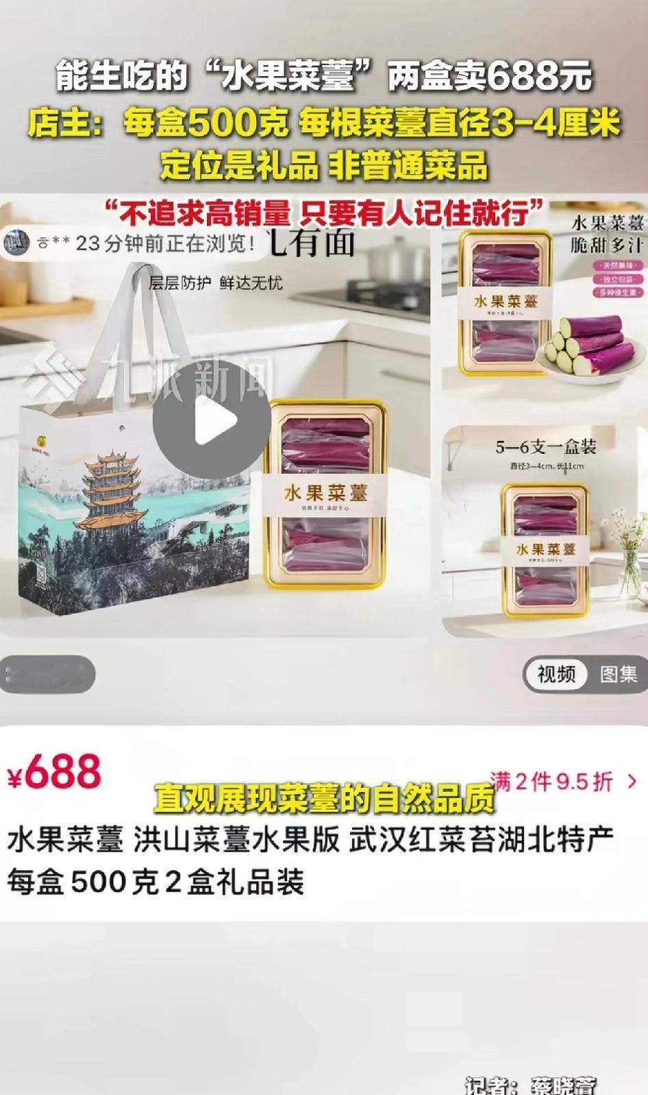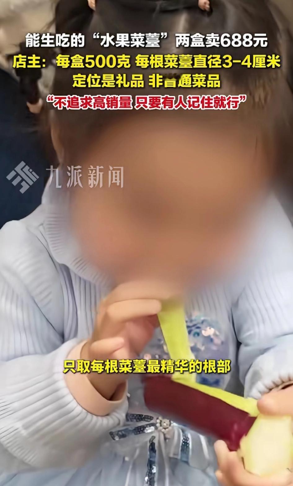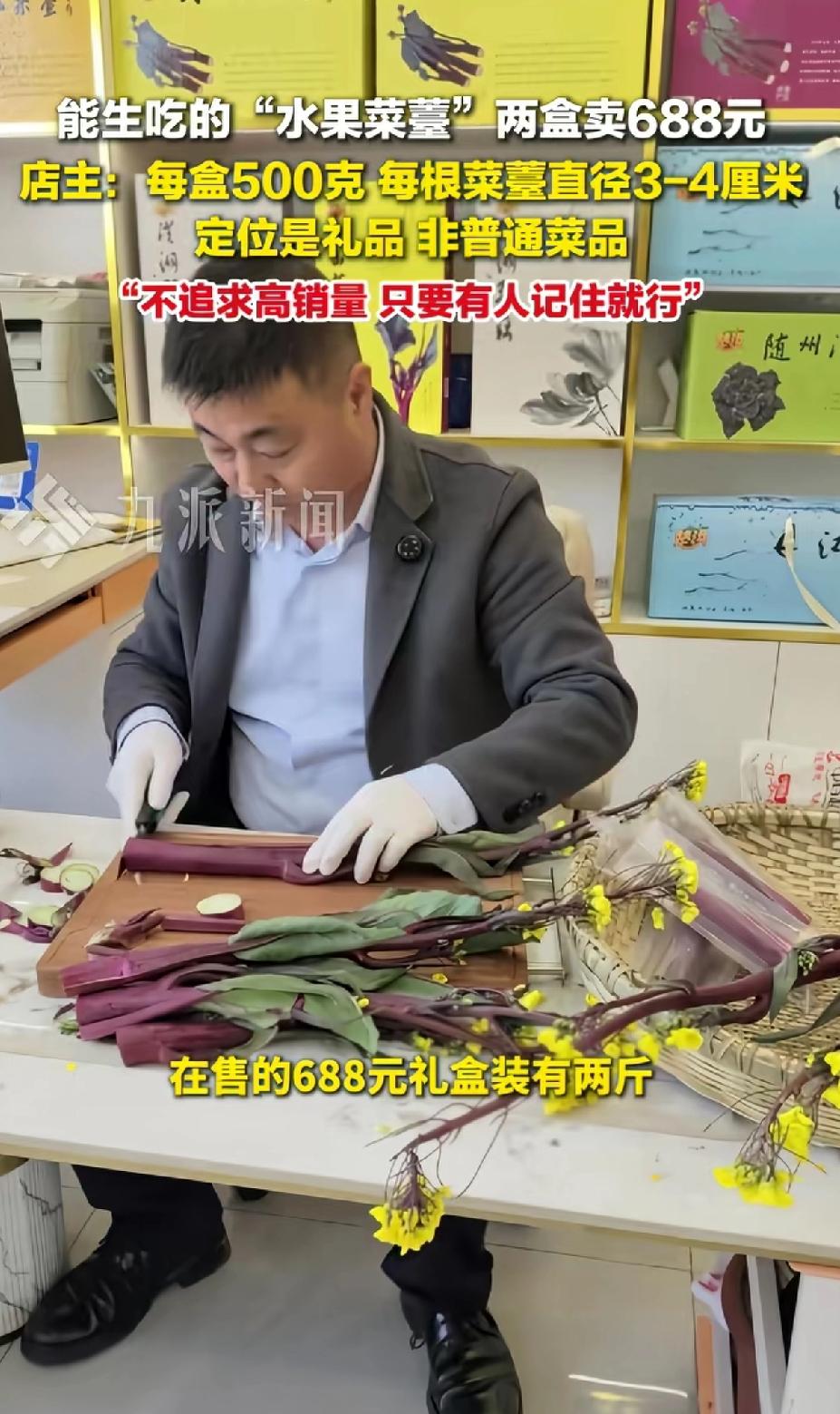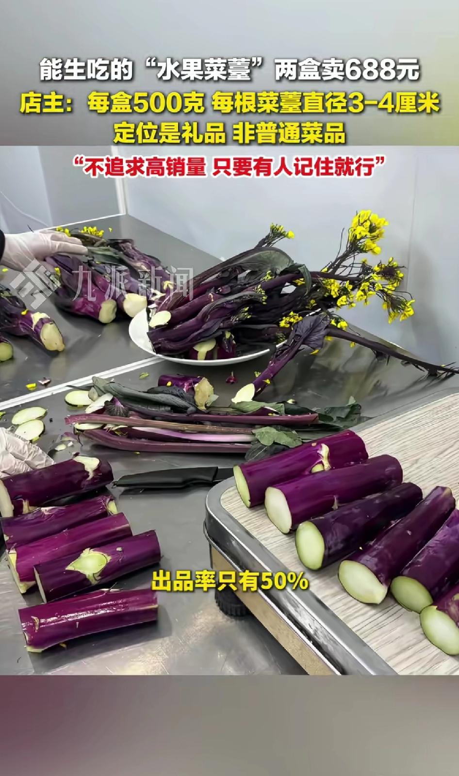 能生吃的“水果菜苔”两盒卖688元 店主:每盒500克,每根菜苔直径3-4厘米定位是礼品,非普通菜品。 店主:不追求高销量,只要有人记住就行了。 武汉特产店推出的可生吃“水果菜苔”火了,两盒688元的价格让人惊掉下巴!平时常见的紫红色菜苔,冬季售价也就每斤2元到几十元,这“水果菜苔”直接飙升到每斤约344元。 熟的都不好吃,还生的,老板只一味精选、精品包装不行,印上巴黎世家,或LV奢侈品的标志。要特别说明“限量10份”新品,打着这样的营销口号,保准一经售卖瞬间抢空。等炒火了,再降价。最好跟奢侈品打一场官司,老百姓抱着好奇的心态就买账了。 店主说这是定位礼品,每根菜苔直径3 - 4厘米,节疤不超一个,选材严格。而且只取菜苔最精华的约10厘米根部,两斤精品菜苔才出一斤“水果菜苔”。 虽说能让人体验洪山菜苔生吃的清甜口感,但这价格,普通消费者还真难接受,估计也就买来送礼才会考虑了。