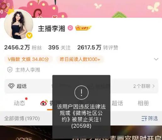 李湘账号全网锁死!禁止关注! 前脚在巴黎挥霍百万买包,后脚千万粉丝账号瞬间冰封... 1 月 16 号早上,不少网友刷社交平台时突然被一条消息炸懵了 —— 李湘的微博、抖音、小红书账号竟然全被 “锁死” 了。 不管是老粉想重新关注,还是新粉好奇点进去,都只能看到灰色的关注按钮,点下去直接弹出 “该用户因违反法律法规或社区公约被禁止关注” 的提示,试了刷新、换设备,结果全都一样,这波操作让全网瞬间沸腾起来。 大家一边截图求证,一边扒着各个平台的账号细节。微博上,她那 2400 多万粉丝的主页还挂着历史内容。 最新一条停留在 2025 年 12 月 31 日,是女儿王诗龄和张艺兴的跨年合照,背景里的伦敦烟花和香槟杯还透着热闹劲儿,可如今评论区早已被 “怎么不能关注了” 的疑问刷屏。 抖音上更绝,直接搜不到她的账号,之前 400 多万粉丝攒下的带货视频、日常分享,一下子成了 “隐藏内容”,只有之前关注过的人能勉强看到历史动态,却没法互动。 小红书上的 40 多万粉丝也面临同样情况,客服只回应 “记录核实”,没给任何具体原因,让这场封禁风波更添了几分神秘。 让人唏嘘的是,这场账号冰封来得毫无预兆,甚至和她不久前的高光时刻形成了刺眼的对比。 就在账号被封前两天的 1 月 14 号,李湘还身着高定礼服亮相巴基斯坦驻华大使馆,作为中巴文化交流大使参加建交 75 周年的文化活动,和张艺兴并肩畅谈人文合作。 大使馆还特意发文记录了这一时刻,照片里的她妆容精致、气场全开,完全看不出丝毫要 “翻车” 的迹象。 谁能想到,短短 48 小时,就从官方认可的文化交流场合,跌落到全平台账号被限制关注的境地,这反转比电视剧剧情还刺激。 而更让网友热议的,是她早年间在巴黎挥霍百万买包的名场面,如今被重新翻出来反复讨论。那是 2025 年 10 月,有路人在巴黎香奈儿、爱马仕等奢侈品门店偶遇李湘,她穿着一身剪裁利落的驼色大衣,戴着墨镜,身边跟着两名助理,挑选包包时全程从容淡定。 拿起一款限量版爱马仕只简单问了几句材质,就示意助理刷卡,紧接着又看中了两款香奈儿最新季的手袋和一条钻石项链,前后不过半小时,消费账单就突破了百万。 路人拍到的视频里,她全程面带微笑,对价格似乎毫不在意,助理手里很快就拎满了购物袋,最后一行人坐着黑色豪车离开,留下满店围观的游客议论纷纷。 这段视频当时就引发过一波讨论,如今配上账号被封的消息,更成了大家热议的焦点。 除了巴黎买包,她还曾在直播里展示过三万八的香奈儿外套,一边试穿一边轻松说道 “钱多得花不完”,面对粉丝 “那为啥还直播” 的疑问,她笑着回应 “花钱是乐趣,赚钱是惯性”。 这种松弛的炫富姿态,让她的直播风格独树一帜,吸引了不少追求高端生活的消费者,可也让争议从未断过。 除了炫富争议,她的商业运作也被网友扒出诸多疑点,公开信息显示,她名下关联着 20 家企业,其中 14 家已经注销,注销比例高达 70%。 而且大多集中在 2025 年监管收紧的时期,剩下的 6 家存续企业里,不少参保人数都是 0,这让外界对她的税务合规和资金流向产生了猜测。 直播带货领域的违规记录也被翻了出来,有网友统计,过去 6 个月里,她的账号因虚假宣传、使用绝对化用语等问题被投诉过 12 次。 比如之前推荐一款贵妇护肤品时,宣称 “用一次就能年轻 5 岁”,还拿出过未经证实的检测报告误导消费者,被平台处以停播 30 天的处罚,可处罚过后似乎没起到太多警示作用。 还有早年直播卖貂衣时,因推广动物皮毛制品遭动物保护者抵制,带货高价羽绒服时又因对产品性能不熟悉被网友问住,最后只能以 “团队选品失误” 搪塞过去。 有意思的是,这场风波里,女儿王诗龄的账号成了网友围观的另一个焦点。 她的账号没有受到母亲的牵连,却因为这场风波被网友挤爆,评论区里满是各种提问和调侃,无奈之下,王诗龄只能悄悄关闭了微博评论功能,避免被进一步波及。 而李湘本人和工作室自始至终保持沉默,既没回应账号被封的原因,也没给出任何解释。 并且在1月16号当天,她的账号还多次登录微博超话,反复查看网友的讨论动态,却始终一言不发,这种沉默让局面变得更加扑朔迷离。 从当年《快乐大本营》收视率破 40% 的综艺一姐,到跨界商界的 360 娱乐总裁,再到直播带货的 “吸金女王”,李湘的人生一直充满话题。 流量不是护身符,不管名气多大、粉丝多少,都得守法律法规和公序良俗的底线。 对于这件事,您有什么想说的吗?欢迎评论区留言讨论。 信源:封面新闻2026-01-16——《李湘多个平台账号被禁止关注!》