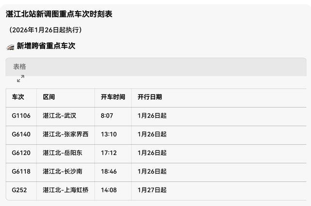2026年1月26日零时起,湛江北站将实施新的列车运行图,新增多趟始发终到的跨省高铁,粤西地区旅客出行将迎来全新升级。