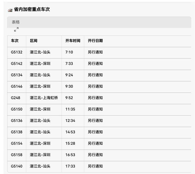 除了跨省线路,湛江北站还加密了前往粤东及珠三角的高铁班次: