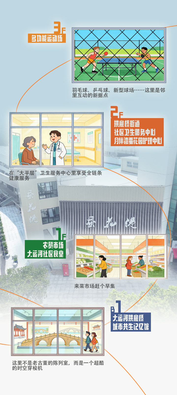 蚕花港邻里综合体的开放,是这场焕新的缩影——大运河社区食堂飘出饭菜香,大运河拱宸桥城市共生记忆馆收藏着共同记忆,屋顶运动场充满活力,社区卫生服务中心提供便捷照护。这个集九大场景于一体的“民生服务枢纽”,使“15分钟公共服务圈”从愿景变为现实。