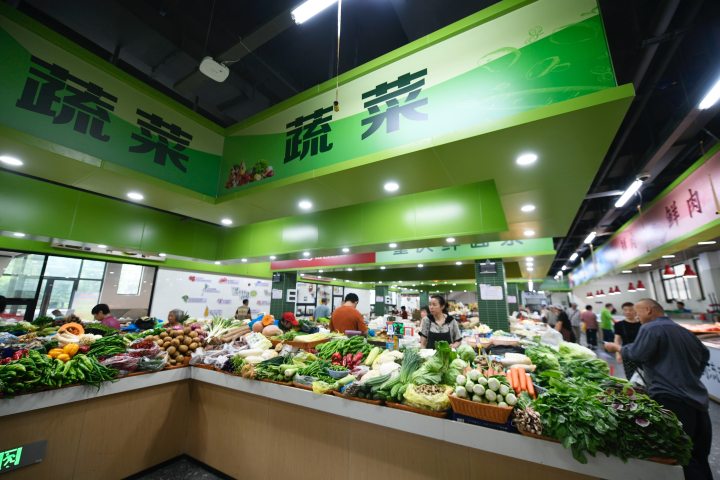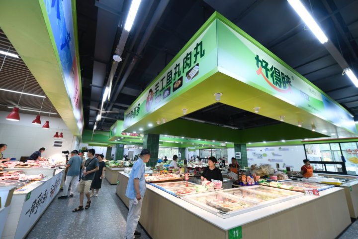 去年开放的蚕花港邻里综合体,一层是熙攘的菜市场,蔬菜区青翠欲滴,肉类区鲜香四溢,杂货铺货品琳琅,超市与临街商铺各具特色。