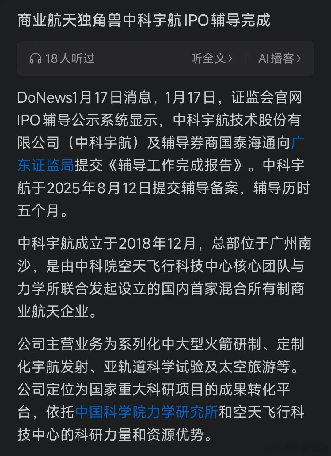 中科宇航间接参股 IPO辅导已验收!1. 越秀资本(000987):通过越秀产业基金管理的商业航天基金,间接持股约2.49%,为公开披露A股中最高比例,连续三轮投资,系第十大股东。2. 广日股份(600894):通过越秀系基金间接持股约0.64%,具备精密制造配套潜力 。3. 达安基因(002030):通过广州科创国发基金(A轮)间接持股约0.38% 。4. 国投资本(600061):通过国科瑞华icon三期基金间接持股,比例未公开 。5. 广百股份(002187):通过全资子公司广州商贸产业基金(B轮)间接参股 。6. 信雅达(600571):通过西安擎川创投间接持股,比例极小 。7. 广联航空(300900):通过产业基金间接持股约0.25%,同时为箭体结构件核心供应商。8. 西部证券(002673)、**中信建投(601066)**等:通过旗下基金少量间接持股(约0.03%—0.08%)。补充要点- 中科宇航已完成上市辅导验收,IPO进程提速,相关参股上市公司或受益于估值提升 。- 除参股外,航宇微、航天宏图、航宇科技等与中科宇航存在业务合作(非股权关联)。a股