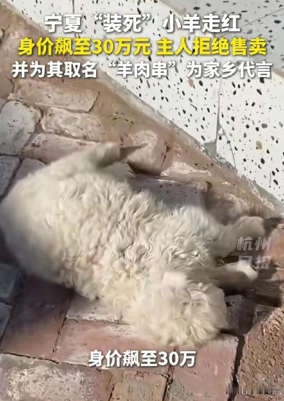 宁夏网红羊身价飙至30万,生活待遇提高,解锁了声控、转圈新技能。专家也发话了,不是装死演技在线,而是基因突变导致的遗传缺陷。主人坚持不卖,要留着宣传家乡,网友们却担心最后会出现“伤仲永”的悲剧! 小羊最初走红还是1月13日,那天它刚出生才10天,主人带着它和3个兄弟姐妹去赶集,要把它们卖掉。 母羊生育后,要么留着养大再卖,羊群数量够的,就会直接卖小羊,这是农村养殖户的基本操作。 其他3只羊,很快以420元一只卖出,到了它这儿,别人一碰,它就倒地装死。 买家怕它身体不好,担心400多块打了水漂,最终没有购买。 看如今这情况,估计肠子都悔青了! 实际上,这只小羊身体没问题,它之所以会这样,专家也解释了: 基因突变导致的强直静止反应,被惊吓或触碰刺激后就会发作,过一会儿就会自行恢复,而不是真的有装死演技。 凭借这个技能,小羊迅速爆火吸粉,不仅有自己独立的圆形小羊圈,主人还会给它穿上衣服,让它进家,待在柔软的毛毯上。 天气好时,放出来让它自由玩耍,晒晒太阳,喝点好喝的,生活质量可谓显著提升。 在主人的引导下,小羊也有了新技能,靠大人声控命令,能够精准做到就地倒下和转圈。不得不说,新脑子就是好用。 如今装死小羊身价持续飙升,有人出30万元购买而不得,主人给它取名“羊肉串”,表示要留着给家乡代言。 实际上,小羊刚出生,胆子小,这种装死情况才会经常发生。随着慢慢长大,身体发育,胆子也大了,装死频率会下降很多。 这也是为啥小羊会和小孩愉快玩耍,碰到大人就装死倒地的原因。 因此不少网友担心,主人若此时不高价出手,几个月后小羊长大,装死技能消失,风头过去,身价必然暴跌。 就像王安石笔下的仲永,天赋消失后,泯然众人! 在我看来,小羊第一次没被卖掉,这已是和主人的缘分,如今又为主人带来流量效应,更是功不可没。若为了钱,草率转手,是刻薄寡恩。 另外,主人用它来宣传家乡,让更多人了解宁夏平罗,了解当地特产和风景,这是让更多人受惠受益的好事,比简单一卖,更有意义。 况且小羊学习技能那么强,短短几天便学会了新技能,后期能成功转型也说不一定。 人与动物之间,原本就有很多温情,金钱不能衡量一切,彼此珍惜最难能可贵……