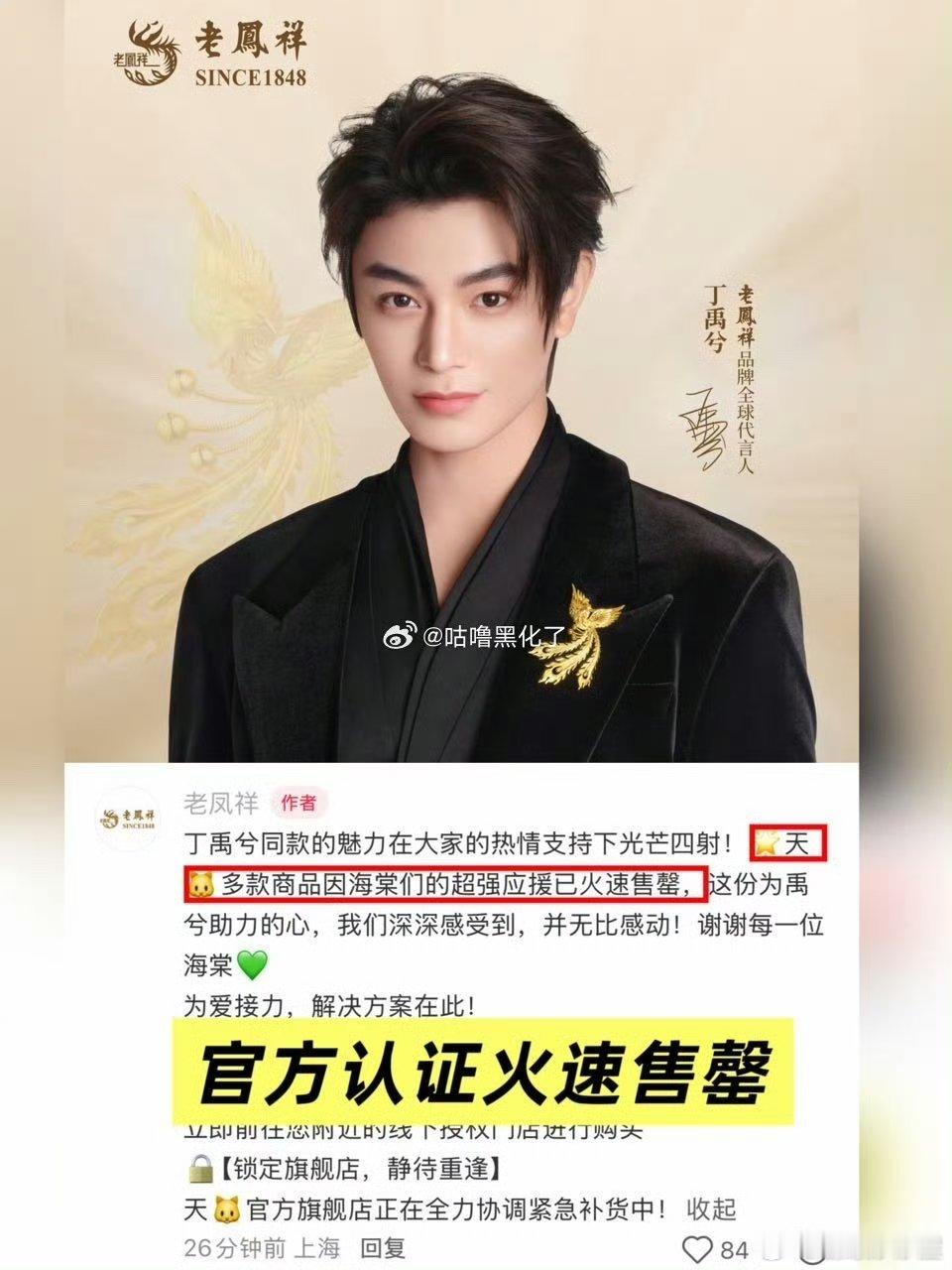 丁禹兮老凤祥官宣后官方链接火速售罄,速度惊人,昨天还官宣了QQ音乐超级会员代言人