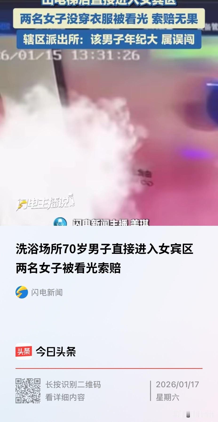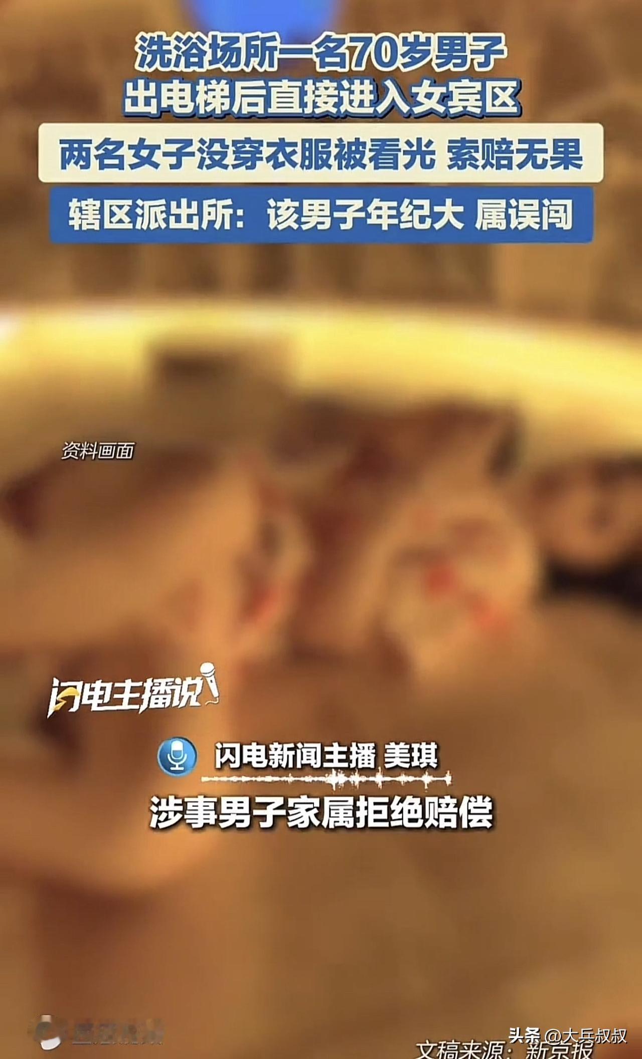吉林,一男子和朋友在洗浴中心刚洗完澡,还没来得及穿衣服,没想到就碰到一男子闯进了女浴室,男子看了两人一眼之后便转身离开,女子和朋友气愤之余,穿好衣服当即找到了洗浴中心讨说法并报了警,事发后,女子要求赔偿,遭到洗浴中心和男子家属拒绝,男子家属认为,70多岁了老人眼花走错了很正常,没必要揪着不放。 据关女士介绍,事发当天,自己和朋友来洗浴中心放松心情,结果在准备穿衣服的时候,突然碰到一男子闯进了女浴室,男子看了两人一眼后就转身离开。 因为自己和朋友当时都没穿衣服,所以被这样看了一个精光感到很不适和气愤,穿好衣服后就找到了洗浴中心讨说法,同时,顾女士选择了报警求助。 洗浴中心调取了监控后,发现这名男子从电梯中出来后,直奔女浴室,随后便又退出了女浴室。 事发后,关女士要求洗浴中心和男子予以赔偿,洗浴中心认为自己没责任,而男子家属更是拒绝赔偿,理由是男子已经70多岁了,眼花走错了很正常。而警方经过调查则认为,确实是男子走错了所致。 其实,无论是误入也好,故意的也罢,洗浴中心都难逃责任。 首先,洗浴中心作为一个经营场所,那么,一个经营场所,必然要对顾客的人身和财产安全负责。 民法典规定,宾馆、商场、银行、车站、机场、体育场馆、娱乐场所等经营场所、公共场所的经营者、管理者或者群众性活动的组织者,未尽到安全保障义务,造成他人损害的,应当承担侵权责任。 因此,洗浴中心作为经营场所,有法律上的义务,给顾客提供一个安全的环境,如果没有尽到责任,必然要涉及到赔偿的问题。 就本案来说,就算是男顾客误入,那么,洗浴中心是否在明显区域,放置男浴室女浴室的提示牌,或者是否在相关区域,有工作人员尽心引导?如果没有的话,那么就存在一定的过错,据此是要承担赔偿责任的。 反观顾客,因为顾客已经70多岁了,说句难听的,即便是故意的,因为年龄的问题,想要对其进行处罚,也几乎是不可能了。 治安管理处罚法第二十三条规定,违反治安管理行为人有下列情形之一,依照本法应当给予行政拘留处罚的,不执行行政拘留处罚:(三)70周岁以上的; 因为涉事男子已经70岁了,如果是第一次,或者是没有特别严重的情形,是不会予以执行处罚的,何况男子还是过失走错了,那么更无法对其进行处罚了。 但是,在民事层面,涉事男子有没有问题?如果门帘上已经标明是女浴室,男子还是走错了,进入了女浴室,显然自己是存在一定的过失的,据此,男子应当予以赔偿顾女士的损失,在洗浴中心和男子均拒绝的情况下,顾女士应通过法律程序维护自己的合法权益。 有人说,年纪大了,看不清走错了正常,谁还没犯过错误。还有人说,如果是女的走错了呢,她会去主动赔偿吗? 对此,你对本案有什么看法? —————————— 关注我,带你评析法律热点,关注冷暖人生。 文章原创,抄袭必究