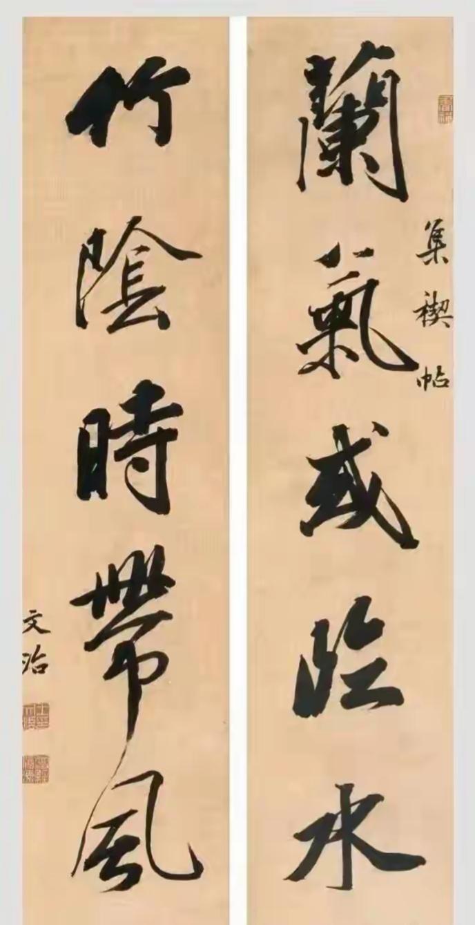 探花五言对联精绝!王文治,清乾隆25年考取探花,与刘墉等并称“清四家”,其书法获“淡墨探花”之誉,辞官后潜心笔墨禅理。书法取法"二王"与董其昌,善用淡墨长锋羊毫,风格秀逸空灵 。 这副行书五言联尽显其风格精髓。墨色浓淡相间,却又柔而有骨,起笔轻落,转锋流畅,收笔牵丝自然。字间留白疏朗,无拥挤之感,字形婉美,与联中清雅意境相契合。以笔墨传兰竹神韵,书法既见帖学功底,又含文人清逸雅致,是其“书为心画”的最生动体现。
