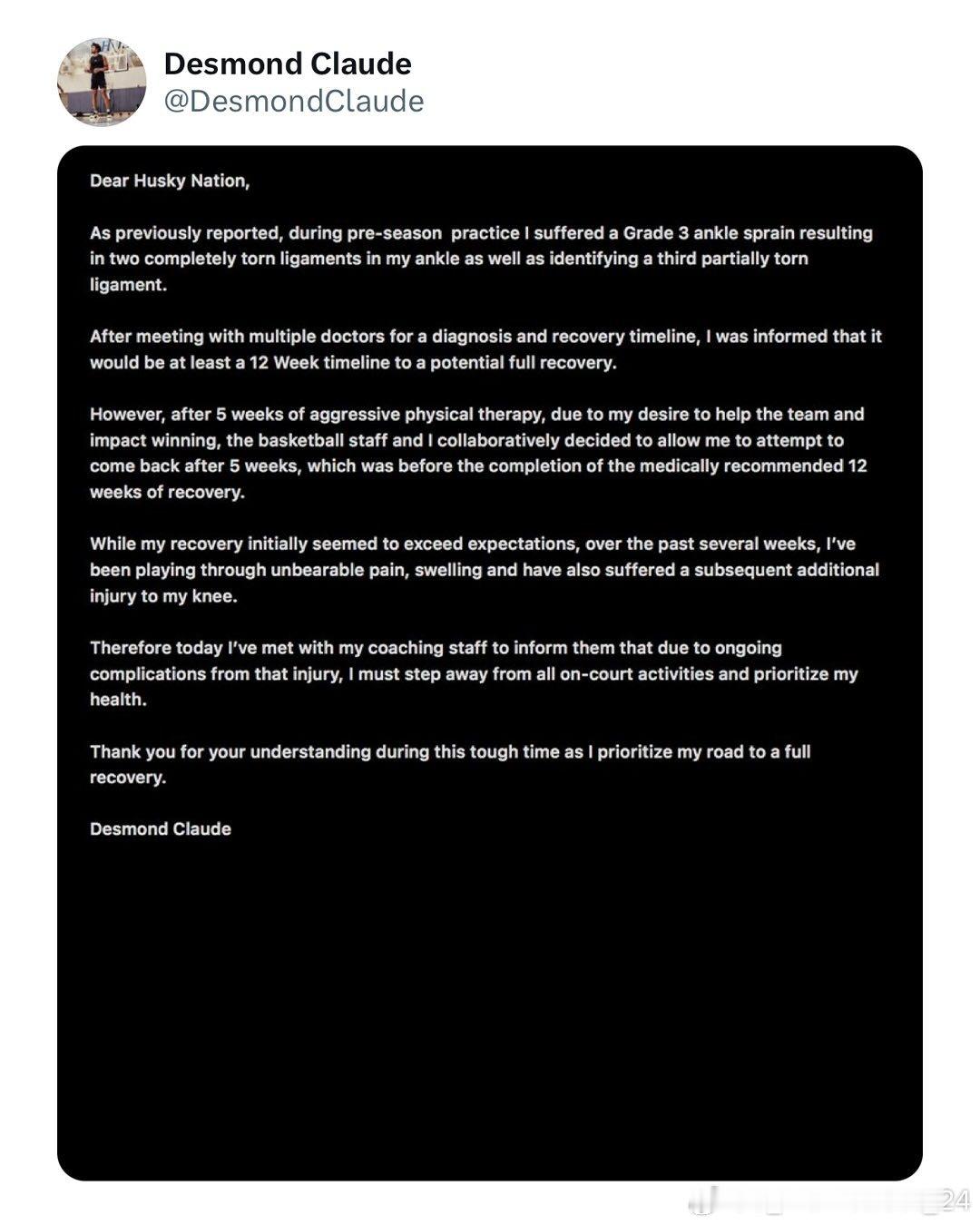 华盛顿大学后卫德斯蒙德·克劳德(Desmond Claude)因持续性伤势,将暂