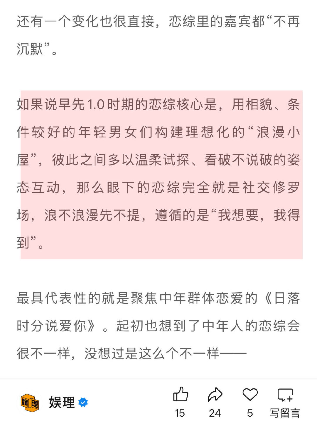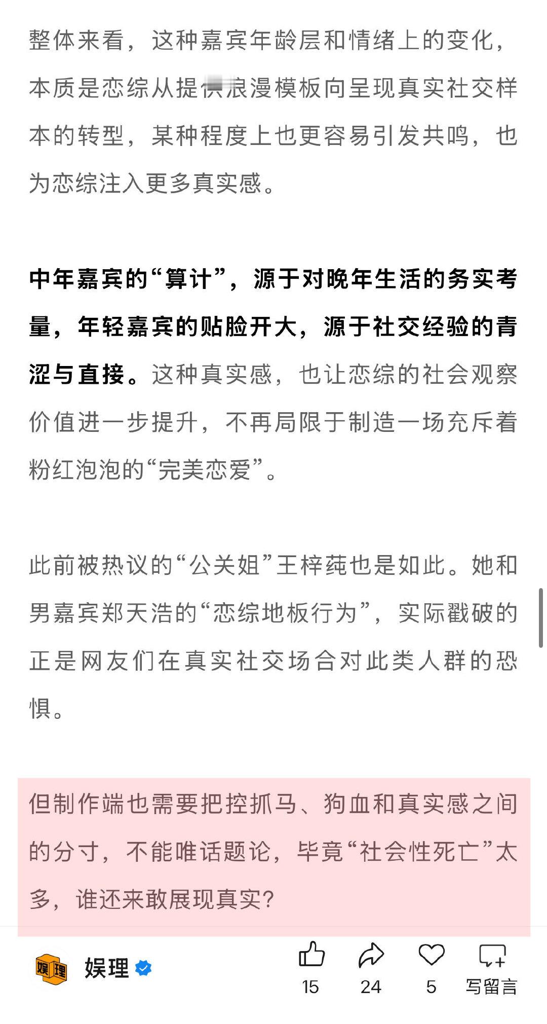 中老年恋综一分钟800个心眼子 恋综正在抛弃明星观察员聚焦中年群体恋爱的《日落时分说爱你》,被网友戏称为“一分钟800个心眼子”。比如男嘉宾刘玉刚的种种表现就不像吃素的。这是因为经历过婚姻和人生历练的中年人,相互探讨的话题也更为朴实。比起其它恋综对个人职业还你瞒我瞒,哥哥姐姐们早已摸透对方退休金能拿多少、孩子有几个…娱理独家↓