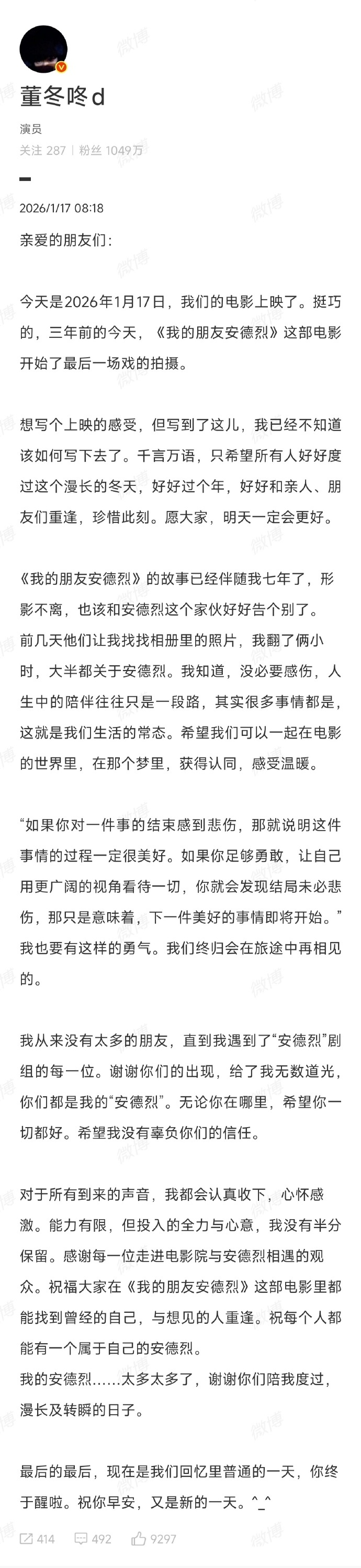 董子健好细腻的文字 董子健关于《我的朋友安德烈》上映的这条微博看得我眼睛湿湿的,情感真的好丰富的一篇文字,能够从字里行间感受到他对电影的用心以及期待啊,希望大家都可以看一下然后给出反馈