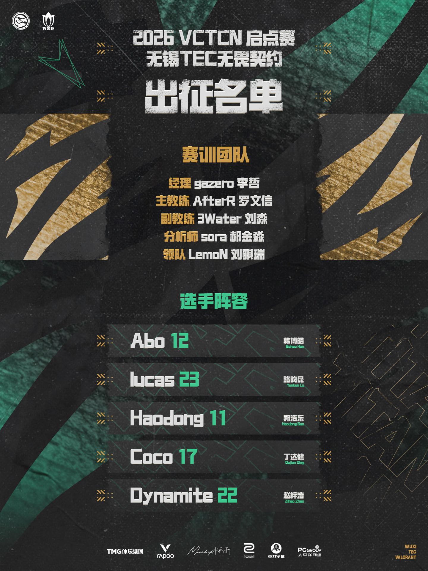 虎扑01月17日讯2026VCTCN启点赛将于1月22日-2月9日正式打响,TEC无畏契约分部官方发布2026VCTCN启点赛出征名单。